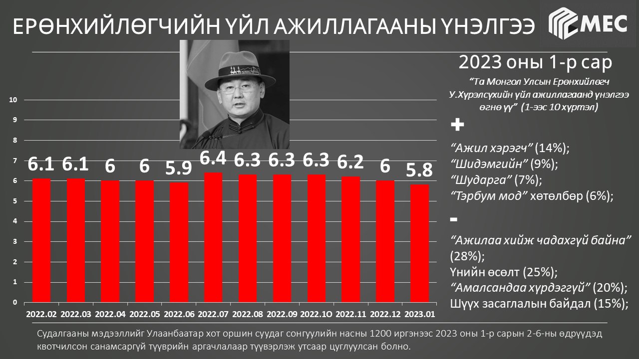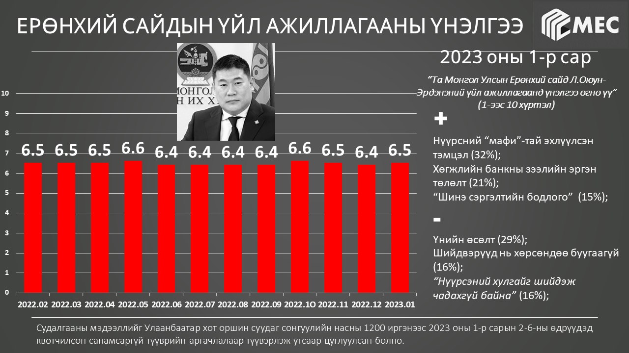 Сар бүр MEC судалгааны байгууллагаас улстөрчдийн чансааг тодорхойлж, түүнийгээ олон нийтэд ил тод зарладаг. Энэ жишгээр тэд 2023 оны НЭГДҮГЭЭР САРЫН судалгааны дүнгээ танилцуулав. Судалгааг санамсаргүй түүврийн аргаар 1200 хүнтэй утсаар холбогдож, авчээ.
