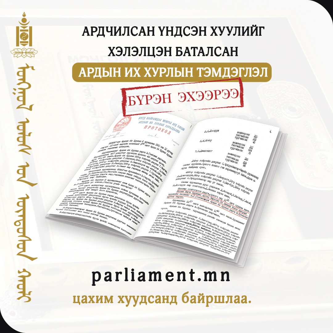 Ардчилсан Үндсэн хуулийг хэлэлцэн баталсан Ардын их хурлын тэмдэглэл бүрэн эхээрээ parliament.mn цахим хуудсанд байршлаа.