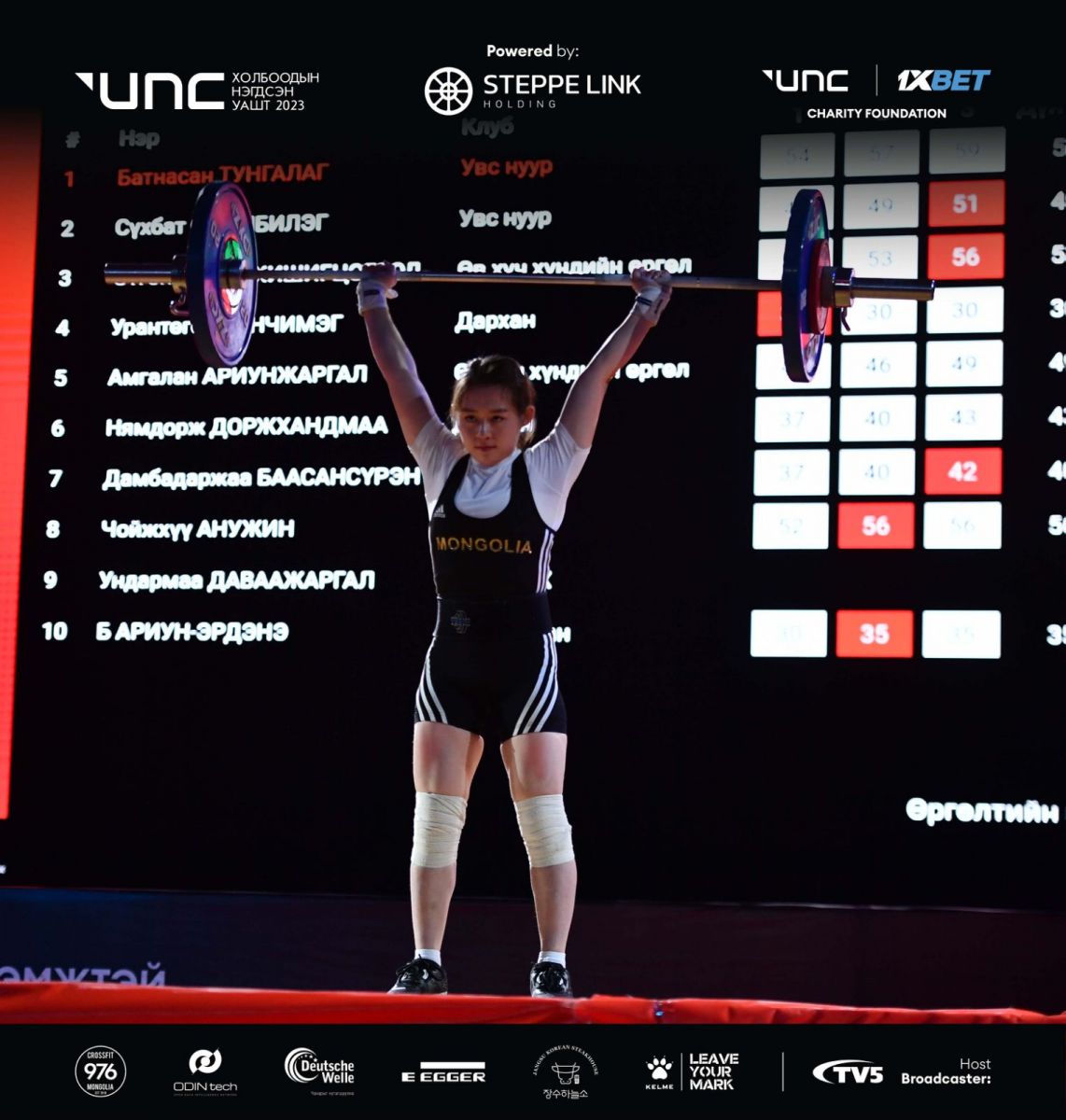 Монголын спортын корпорацаас зохион байгуулж буй “UNC-2023” 15 спорт холбооны УАШТ-ий дөрөв дэх өдөр хүндийг өргөлтийн тамирчид өрсөлдөж байна. Энэ өдрийн эхний жин эмэгтэй -49 кг-д явагдаж, “Увс нуур” клубийн Батнасангийн Тунгалаг үнэмлэхүй ялалт байгууллаа.