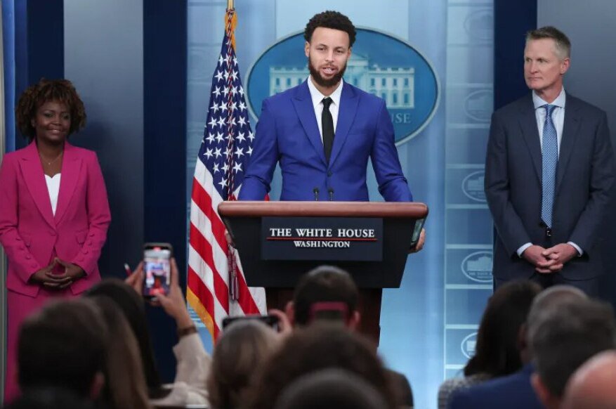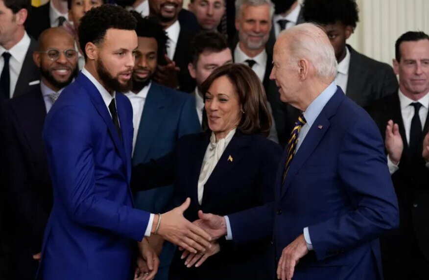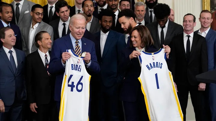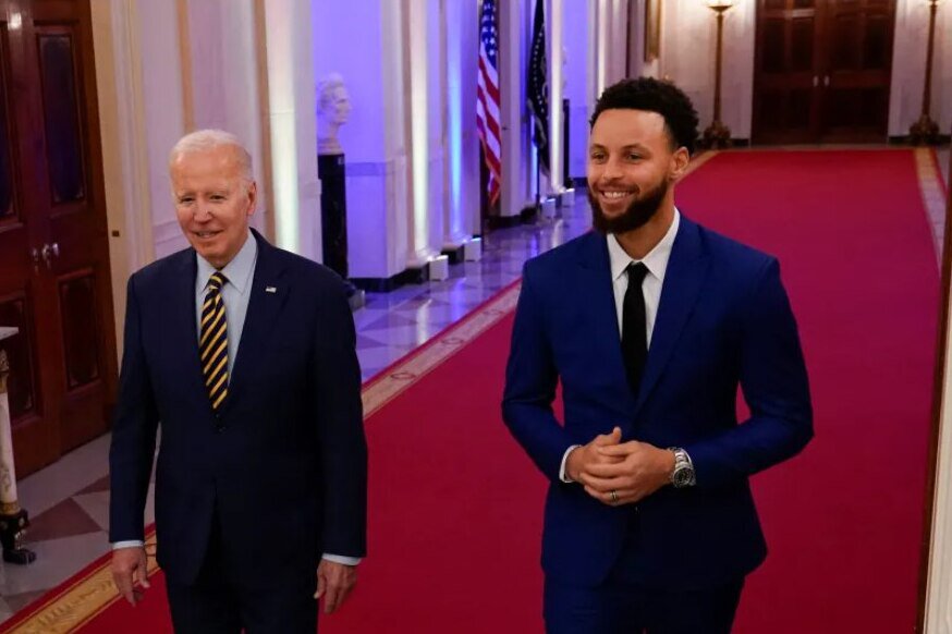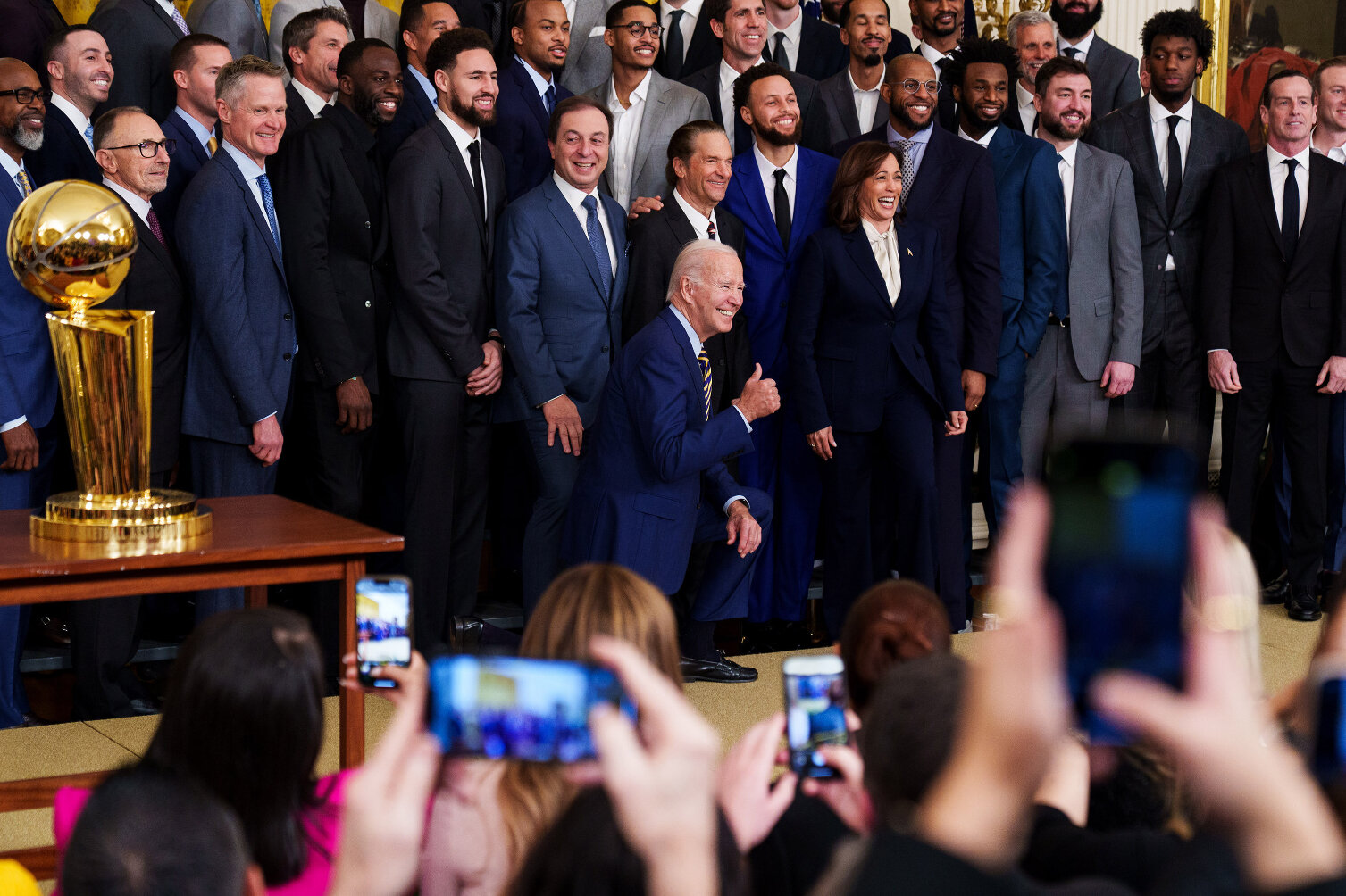 2022 оны финалын цувралын шилдэг тоглогч Стефен Карри багийнхаа нэрийн өмнөөс Ерөнхийлөгч нарт “Голден Стэйт-ийн өмсгөл гардуулан өглөө. АНУ-ын 46 дахь Ерөнхийлөгч Байденд 46, Харрист 1 дугаартай жерси оногдсон юм.