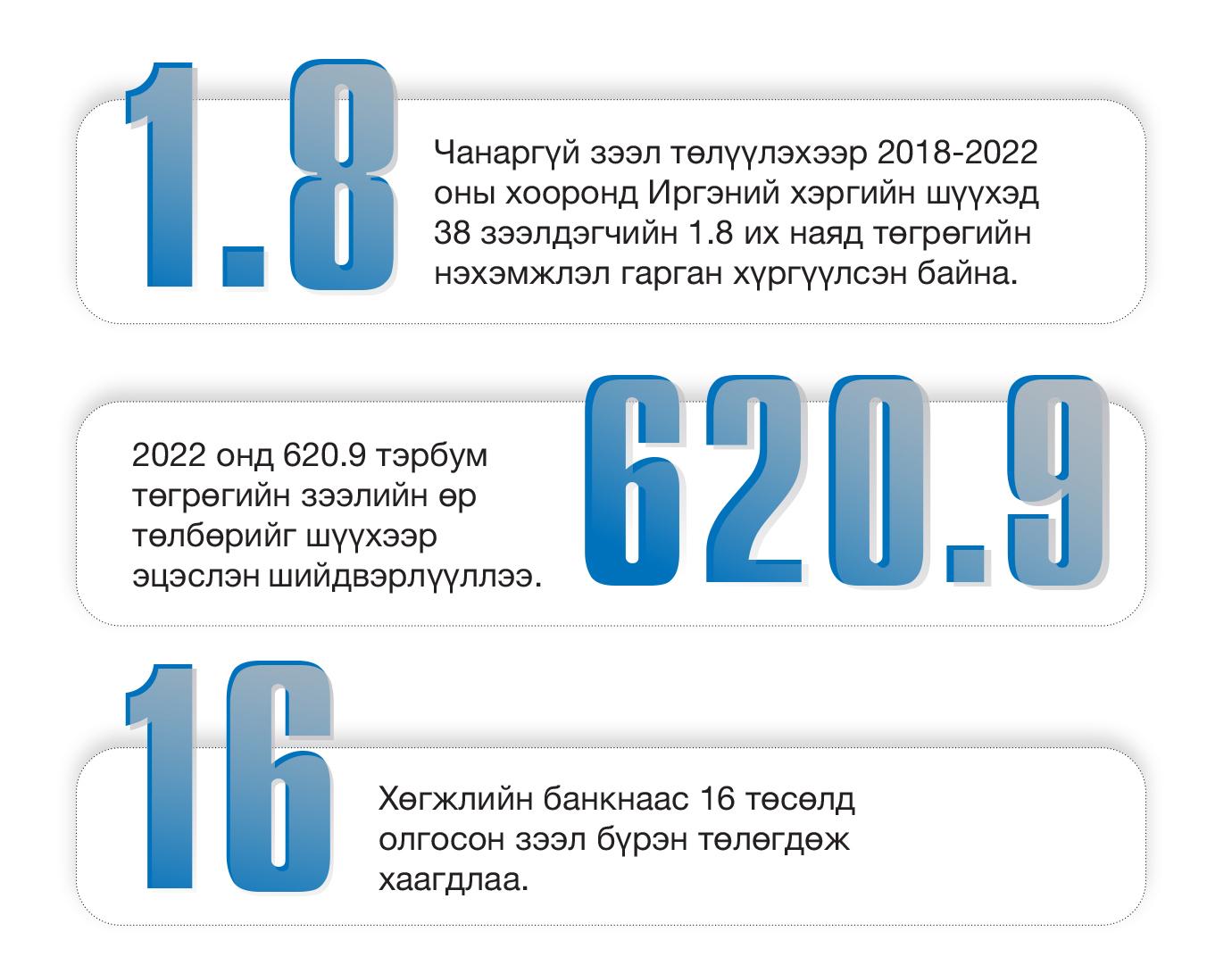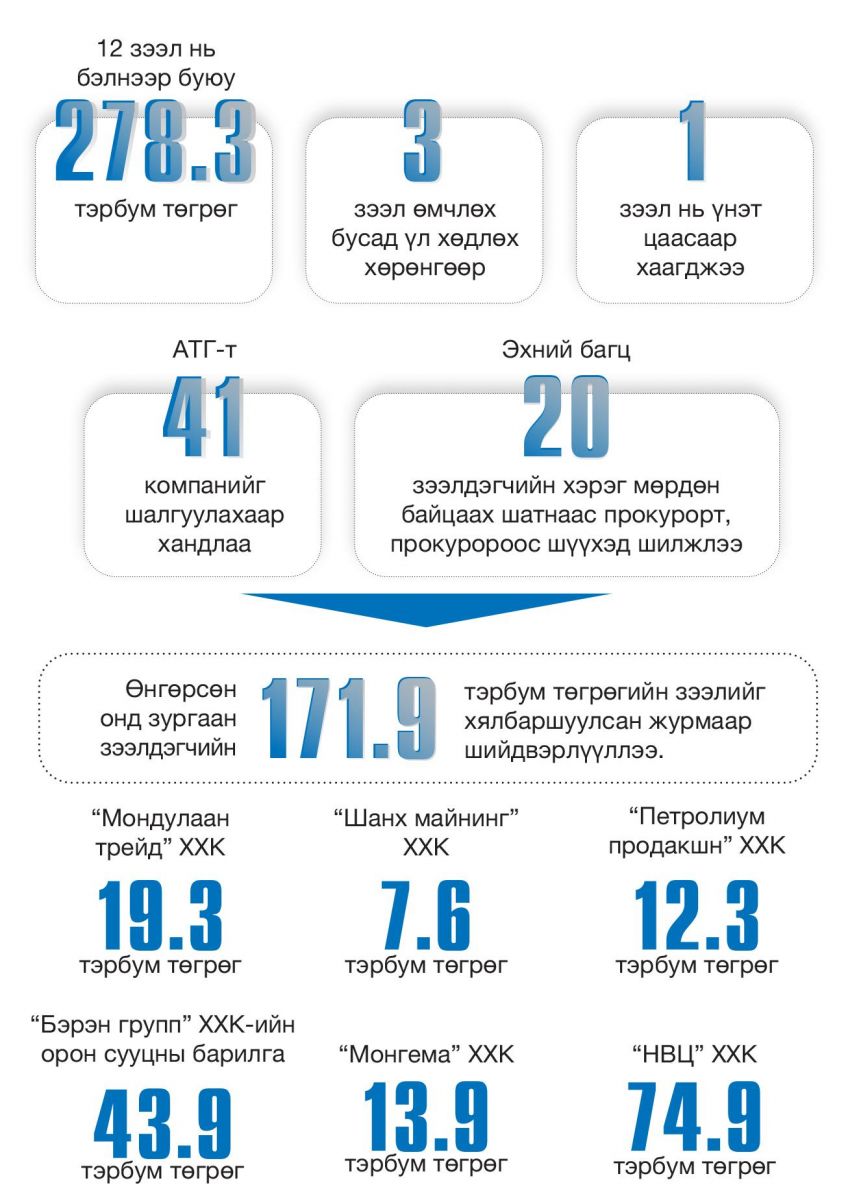 Эдгээрээс 14 зээлийг шүүхийн анхан шатны шийдвэрээр, найман зээлийг шүүхийн ажиллагаагаар шийдвэрлүүлсэн аж.