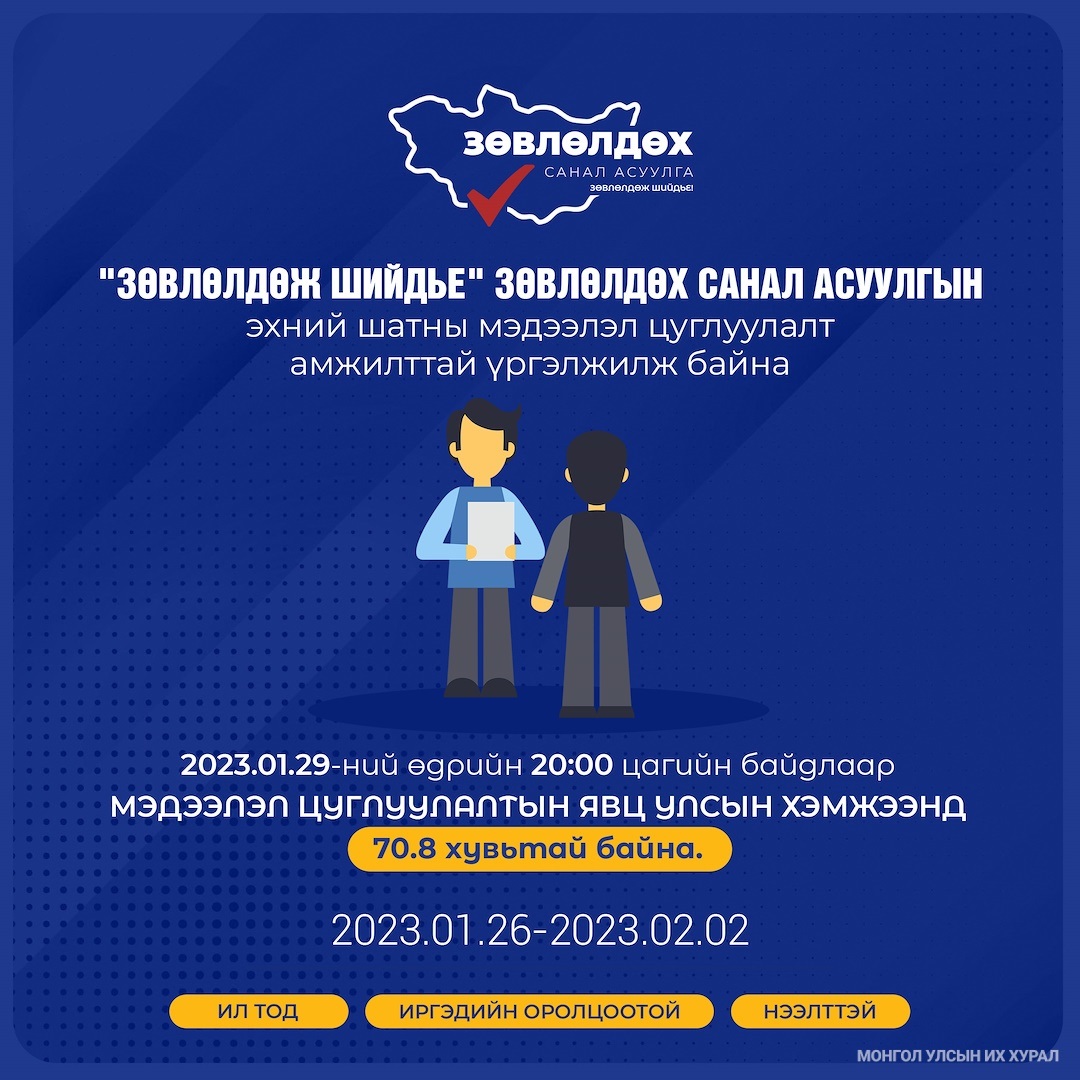 "Зөвлөлдөж шийдье" зөвлөлдөх санал асуулгын эхний шатны мэдээлэл цуглуулалт 2023 оны хоёрдугаар сарын 02-ны өдрөөр дуусгавар болно хэмээн Улсын Их Хурлын Хэвлэл мэдээлэл, олон нийттэй харилцах хэлтсээс мэдээлэв.