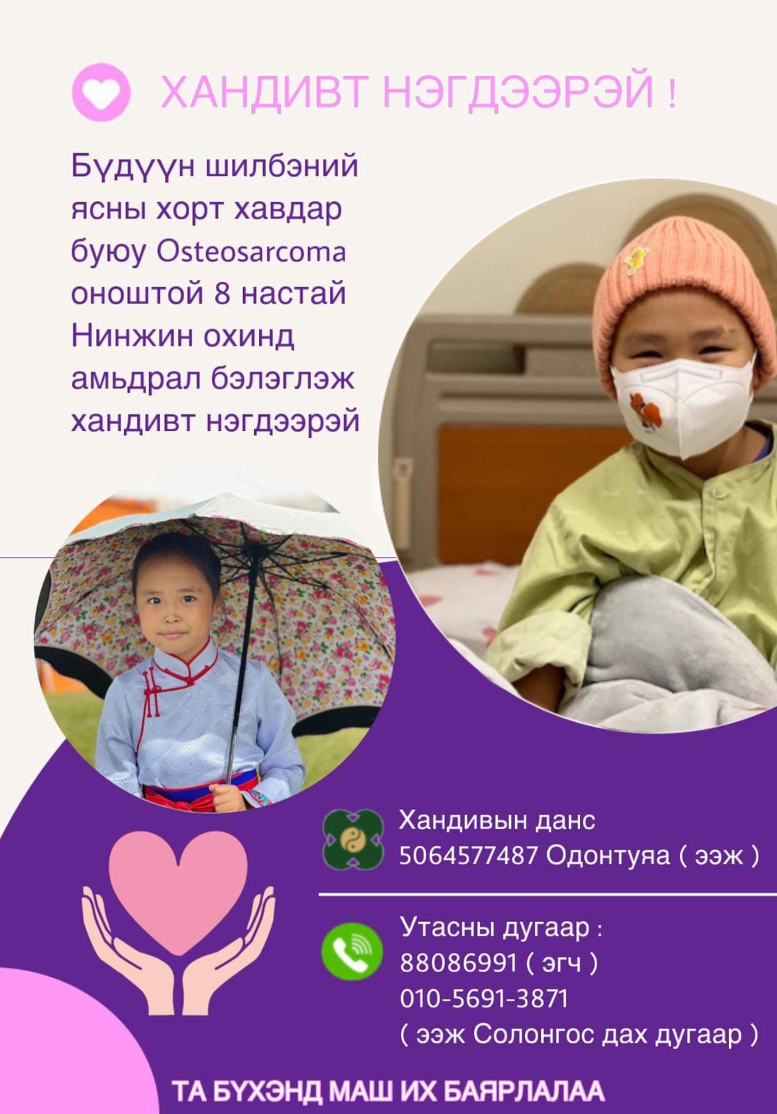 Агарын Нинжин хэмээх наймхан настай охин “Бүдүүн шилбэний ясны хорт хавдар” гэсэн оноштойгоор БНСУ-д эмчилгээ хийлгэж байна. Одоогийн байдлаар хорт хавдрыг авах хагалгаагаа хийлгээд хагалгааны дараах химийн эмчилгээ хийлгэж байгаа аж. Ар гэрийнхэн нь өөрсдийн боломж бололцоогоороо хагалгааны зардлыг төлсөн ч хими эмчилгээний зардал болох 400 орчим сая төгрөг дутсан байна. Тиймээс сайхан сэтгэлт монголчуудаасаа тусламж хүсэж, манай сонинд хандсан юм. Бид бүхэн А.Нинжин охины ээж Д.Одонтуяагийн эгч Д.Анхтуяагаас үүсээд буй нөхцөл байдлын талаар тодрууллаа.