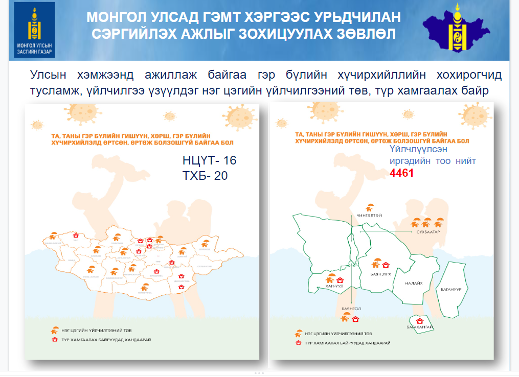 Улсын хэмжээнд ажиллаж байгаа гэр бүлийн хүчирхийллийн хохирогчид тусламж, үйлчилгээ үзүүлдэг нэг цэгийн үйлчилгээний төв, түр хамгаалах байраар 4461 иргэн үйлчлүүлсэн байна. Хүүхэд хамгааллын тухай хууль зэргийн хэрэгжилтийг нэмэгдүүлэхэд 21 аймаг, есөн дүүргийн 390 гишүүнд сургалт зохион байгуулжээ. Түүнчлэн ЦЕГ-тай хамтран 60 сургагч багшийг бэлтгэн, 21 аймаг есөн дүүргийн 327 алба хаагчийн чадавхыг бэхжүүлсэн байна.