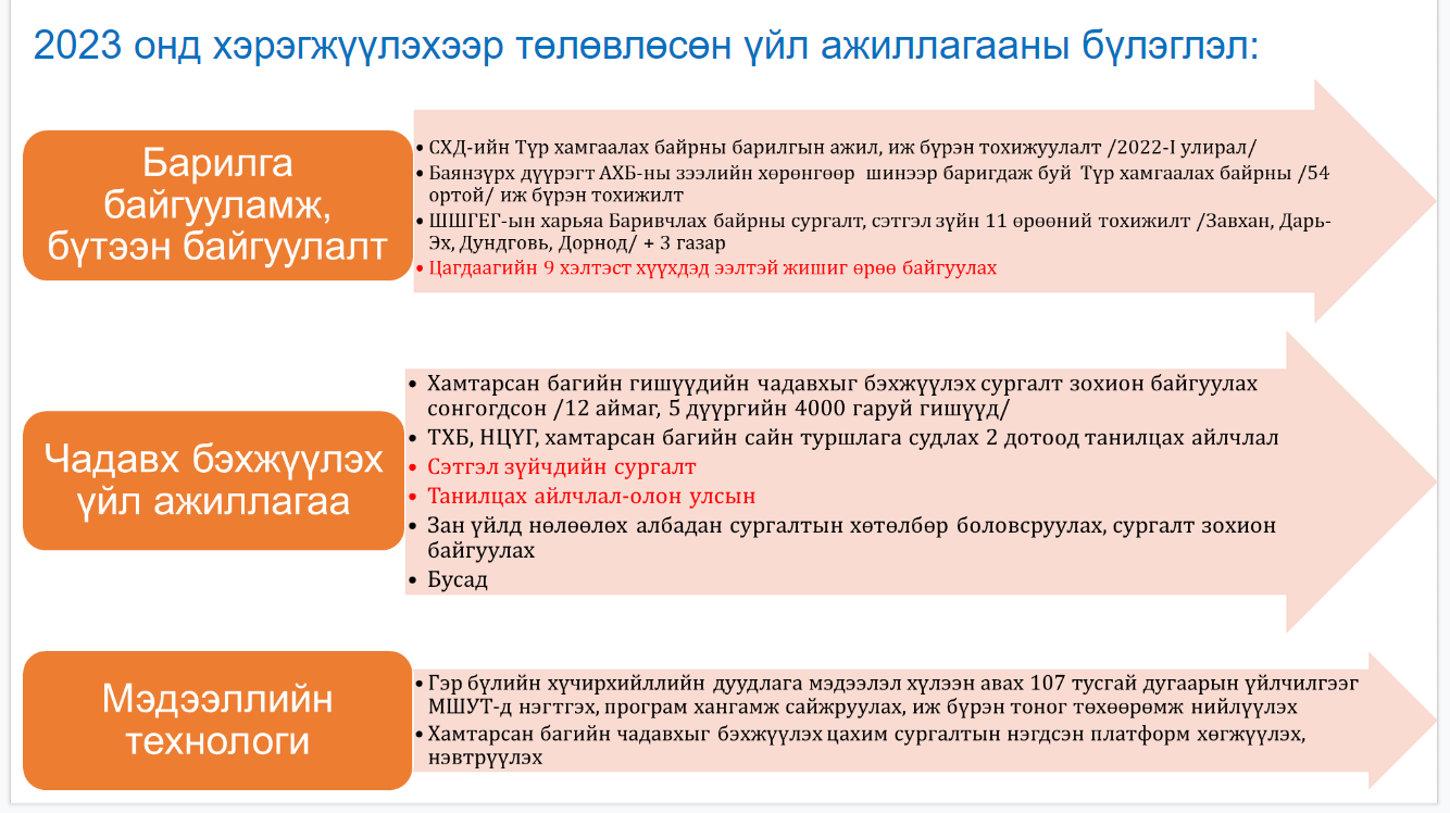Энэ үеэр НҮБ-ын Хүн амын сангийн “Жендерт суурилсан хүчирхийлэлтэй тэмцэх төсөл”-ийн 2022 оны үйл ажиллагааны тайлан, 2023 оны төвлөгөөний талаар НҮБ-ын Хүн амын сангийн жендерийн мэргэжилтэн Л.Билгүүн, Азийн хөгжлийн банкны “Хүүхэд, эмэгтэйчүүдийн эсрэг гэр бүлийн хүчирхийлэлтэй тэмцэх төсөл”-ийн хүрээнд 2022 онд хийж гүйцэтгэсэн ажил, арга хэмжээ 2023 оны үйл ажиллагааны төлөвлөгөөний талаар Хяналт, шинжилгээний мэргэжилтэн Ц.Алтантуяа, Олон улсын эрх зүйн хөгжлийн байгууллагын “Хүүхэд хамгааллын тогтолцоог бэхжүүлэх төсөл”-ийн хүрээнд 2022 онд хийж гүйцэтгэсэн ажлын талаар ОУХЭЗБ-ийн төслийн зохицуулагч Н.Одонтуяа нар мэдээлэл өгсөн юм.
