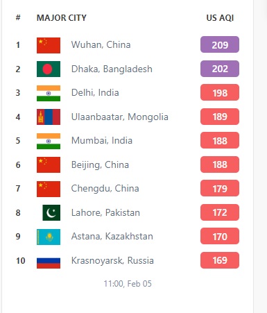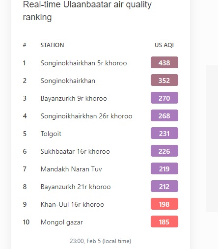 Дэлхийн улс орон, хотуудын агаарын бохирдлыг хэмждэг IQAir сайтаас дэлхийн хамгийн бохир агаартай хотуудын чансааг байнга гаргадаг. Өнөөдрийн байдлаар жагсаалтыг Хятадын Ухань тэргүүлж, Дакка (Бангладеш), Энэтхэгийн Дели эхний гуравт багтсан байна. Манай нийслэлийн хувьд айргийн тавд “итгэл төгс” багтаж, дөрөвт бичигджээ.
