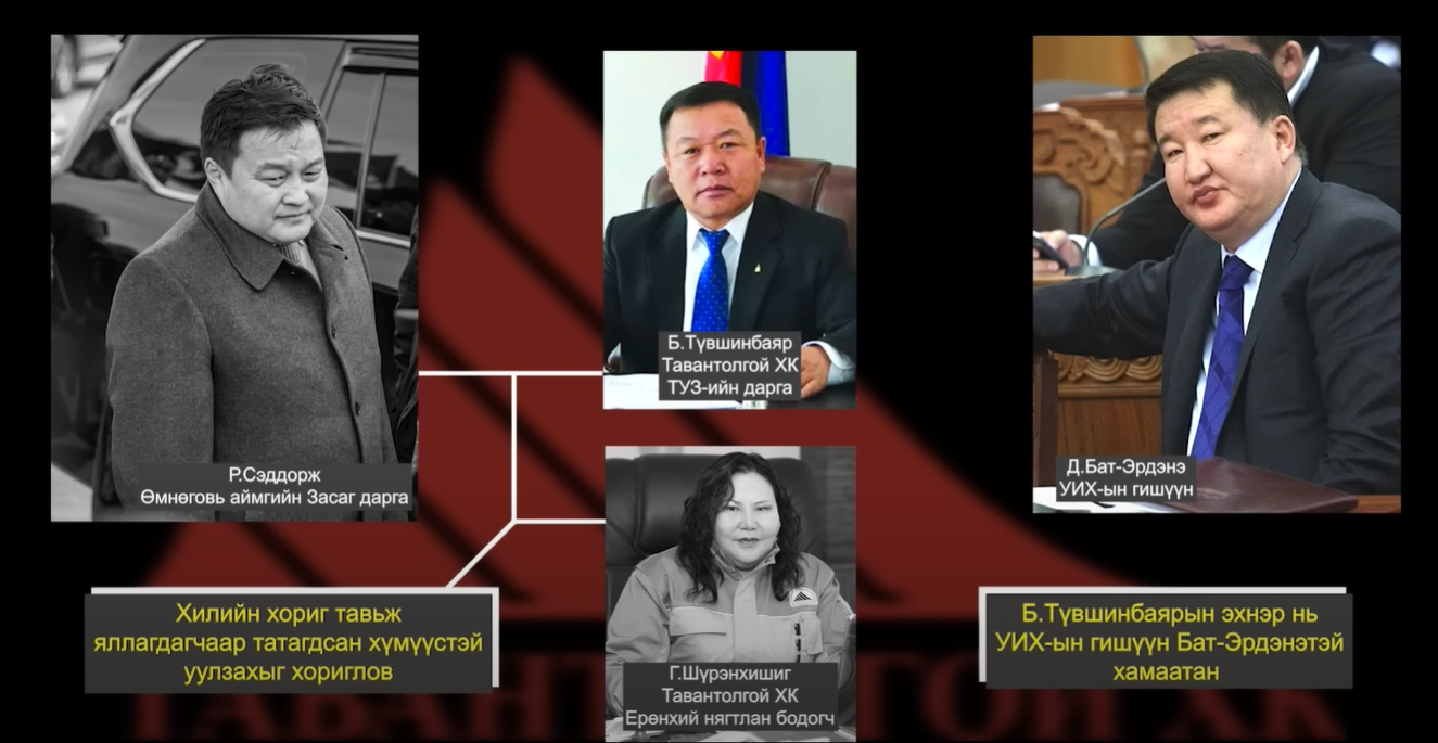 Тэдний дэлгэж тавьсан баримтаас үзвээс дээрх хулгайд алдагдаж, хил давсан нь тогтоогдсон 340 мянган тонн нүүрсний хэрэгт Өмнөговь аймгаас сонгогдсон УИХ-ын гишүүн, “Ажнай” Д.Бат-Эрдэнийн "бүлэглэл" холбогдож байна.