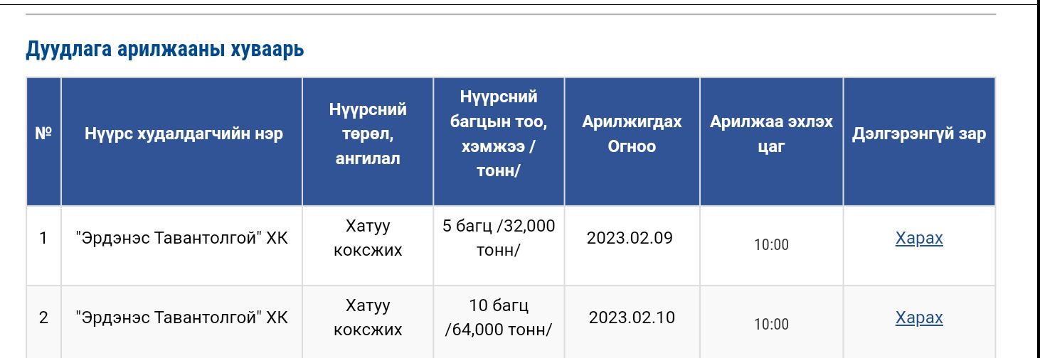 Экспортод гаргах нүүрсний дуудлага арилжааны хуваарь гарсан байна. Тодруулбал, "Эрдэнэс Тавантолгой" ХК энэ сарын 9-ний өдрийн 10.00 цагт 32.000 тонн хатуу коксжих нүүрс, 10-ны өдөр 64.000 тонн хатуу коксжих нүүрс цахимаар худалдах аж.