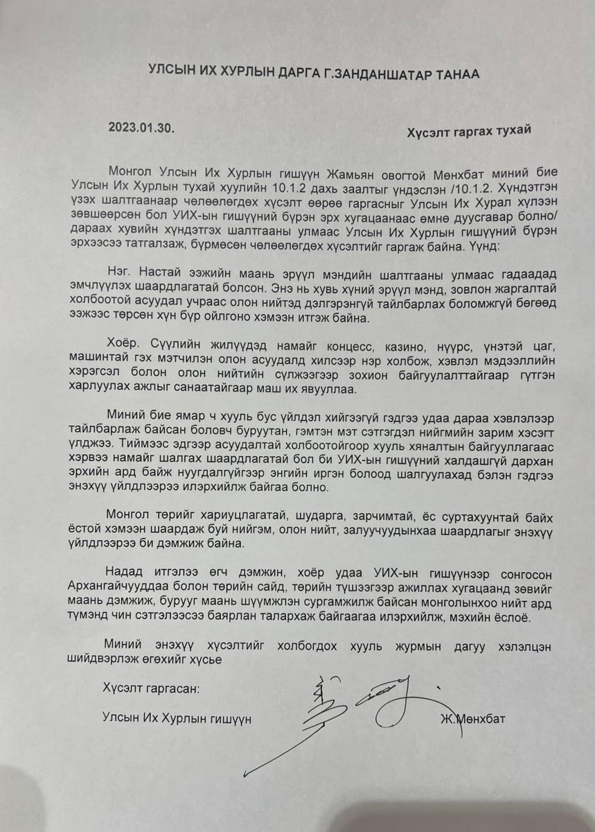 УИХ-ын гишүүн Ж.Мөнхбат бүрэн эрхээсээ хүндэтгэх шалтгааны улмаас татгалзаж, бүрмөсөн чөлөөлөгдөх хүсэлтээ УИХ-ын дарга Г.Занданшатарт өнгөрсөн сарын 30-ны өдөр өгсөн.