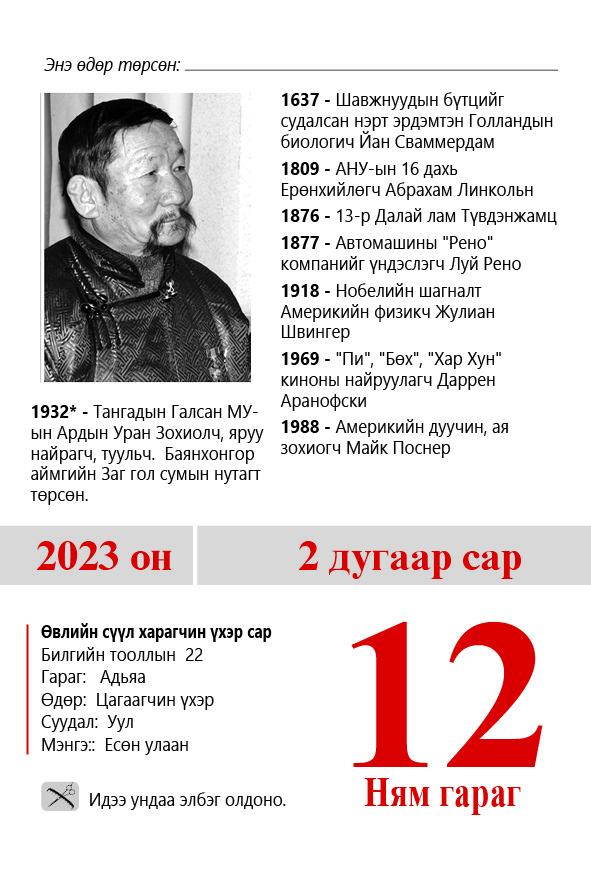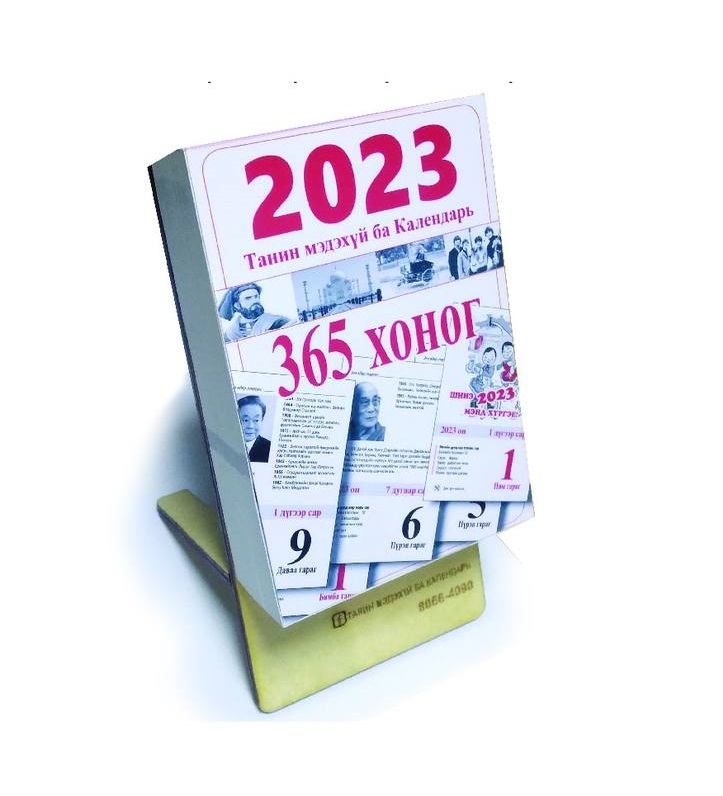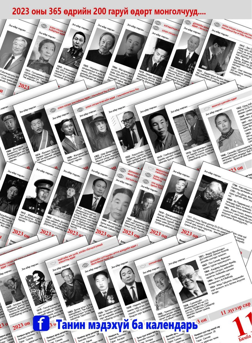 Тэгвэл яг ийм “Танин мэдэхүй ба календарь-2023” хуанли худалдаанд гараад байна. Энэхүү календарьт жилийн 365 өдөр бүр тухайн өдөр төрсөн онцлох хүний товч намтрыг фото зургийн хамт оруулжээ. Нийт 200 орчим өдөрт нь Монголын нийгэмд тодорхой байр суурь эзэлсэн хүмүүсийг багтаажээ.