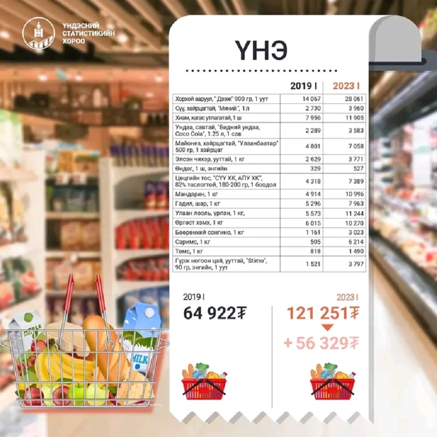Хүнсний гол нэрийн 16 бүтээгдэхүүнийг сонгож авч үзэхэд, нэр төрлөөс хамааран үнэ 40 хувиас 12.3 дахин өссөн байна.