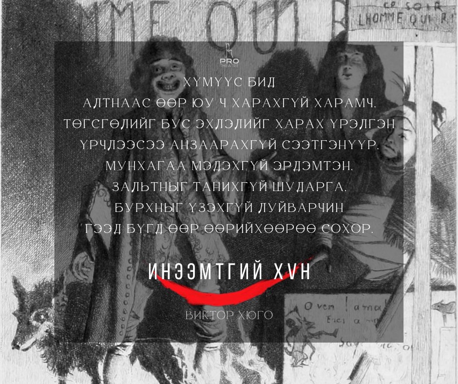 Тэд Францын алдарт зохиолч Виктор Хюгогийн туурвисан бүтээлүүдийн ноён оргил болох “Инээмтгий хүн” романыг тайзны бүтээл болгон ирэх гуравдугаар сарын 4-ий өдрөөс эхлэн үзэгчдийн хүртээл болгох гэж байна.