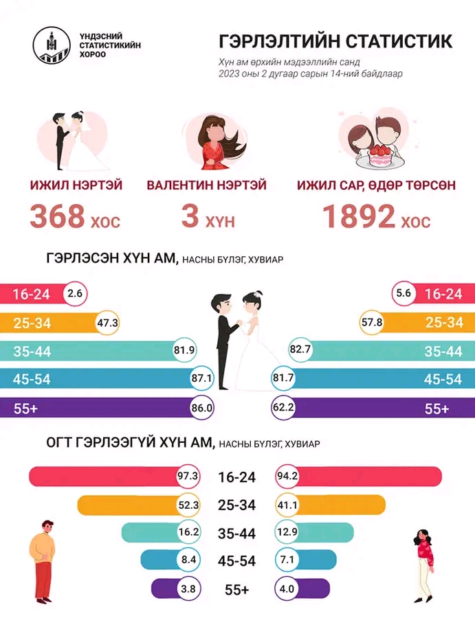 Өнөөдөр хоёрдугаар сарын 14 буюу Валентиний өдөр тохиож буйтай холбоотойгоор Үндэсний статистикийн хорооноос дээрх инфографик мэдээллийг өглөө.
