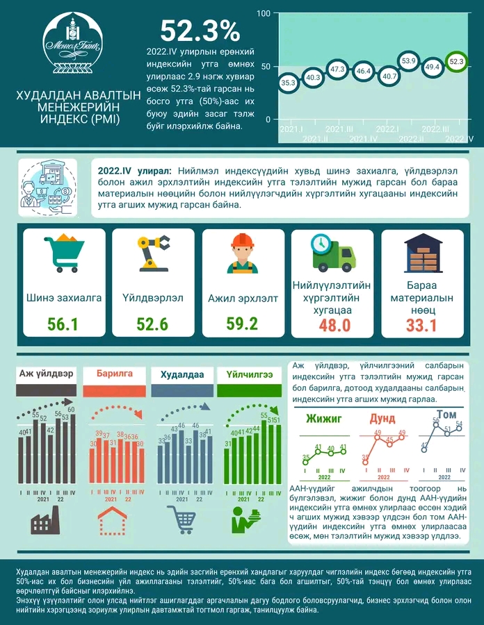 Эдийн засгийн ерөнхий хандлагыг харуулдаг PMI-ийн 2022 оны дөрөвдүгээр улирлын судалгааны дүнгээр индексийн утга өмнөх улирлаас 2.9 нэгж хувиар өсөж, 52.3%-тай гарсан нь босго утга 50%-иас их буюу эдийн засаг тэлж буйг илтгэж байна.