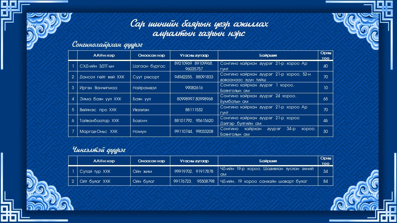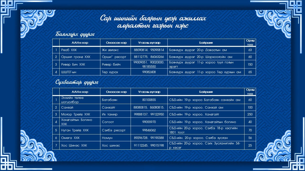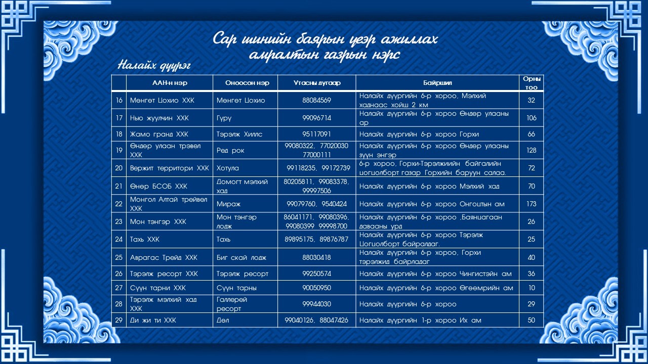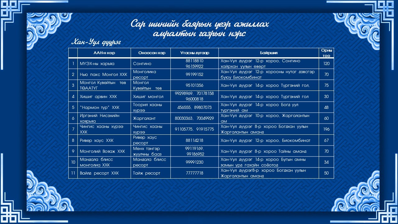 Нийслэлийн аялал, жуулчлалын газраас Сар шинийн өдрүүдэд ажиллах амралтын газар, жуулчны баазуудын ажиллах хуваарийг танилцууллаа. Сар шинийн баярын өдрүүдэд гэр, бүлээрээ цэвэр агаарт тухлах боломжийг дараах жуулчны баазууд олгож байна.