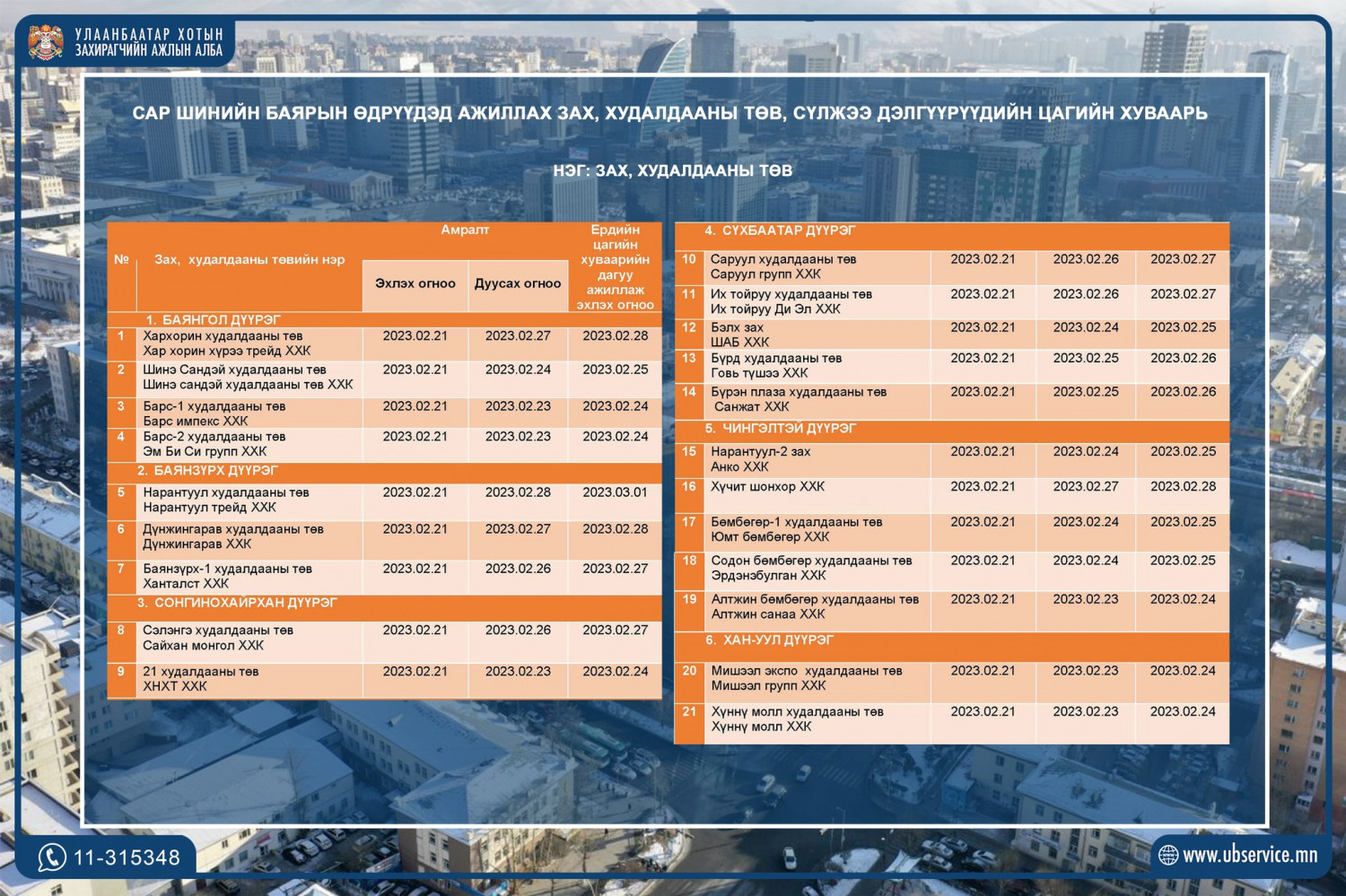 Монголын уламжлалт сар шинийн баярын өдрүүд үргэлжилж байгаатай холбоотойгоор томоохон зах худалдааны төвүүдийн ажиллах цагийн хуваарьт өөрчлөлт оруулаад байгаа юм.