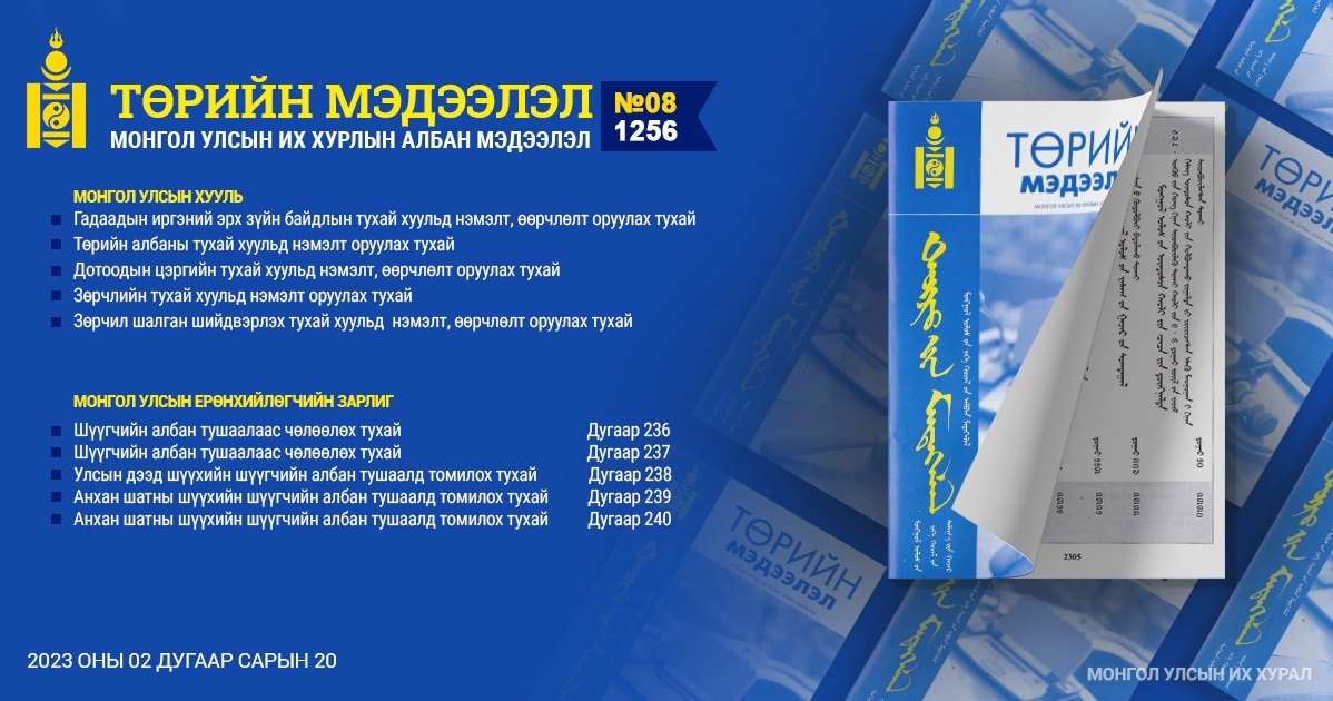 “Төрийн мэдээлэл” эмхэтгэлийн шинэ дугаарт Гадаадын иргэний эрх зүйн байдлын тухай хуульд нэмэлт, өөрчлөлт оруулах тухай, Төрийн албаны тухай хуульд нэмэлт оруулах тухай, Дотоодын цэргийн тухай хуульд нэмэлт, өөрчлөлт оруулах тухай, Зөрчлийн тухай хуульд нэмэлт оруулах тухай, Зөрчил шалган шийдвэрлэх тухай хуульд нэмэлт, өөрчлөлт оруулах тухай Монгол Улсын хуулиудыг нийтэлсэнтэй дэлгэрэнгүй танилцах боломжтой.