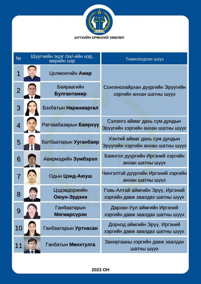 Үүнээс дээрх 11 хуульчийг Монгол Улсын Ерөнхийлөгч бүрэн эрхийнхээ хүрээнд, хуулийн хугацаандаа шүүгчээр томиллоо.