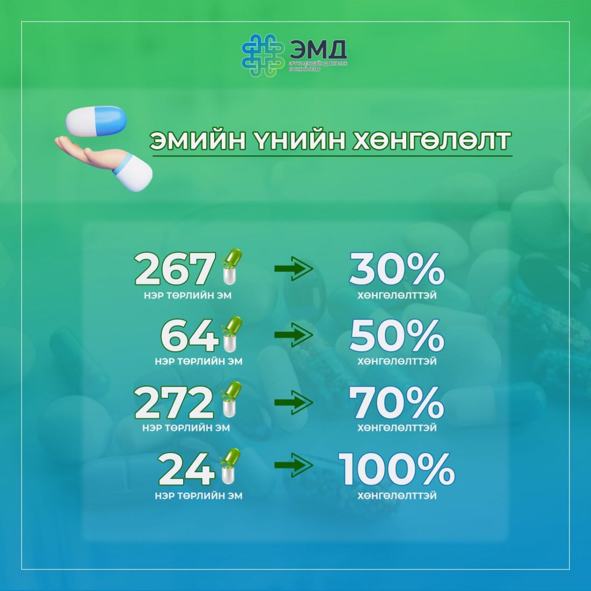 ЭМДҮЗ-ийн 11 дүгээр тогтоол болон ЭМДЕГ-ын даргын тушаалаар ерөнхий нэршлийн 159, худалдааны нэршлийн 621 эмийг 160 гаруй оношийн хүрээнд 30-100 хувийн хөнгөлөлттэй олгож байна.