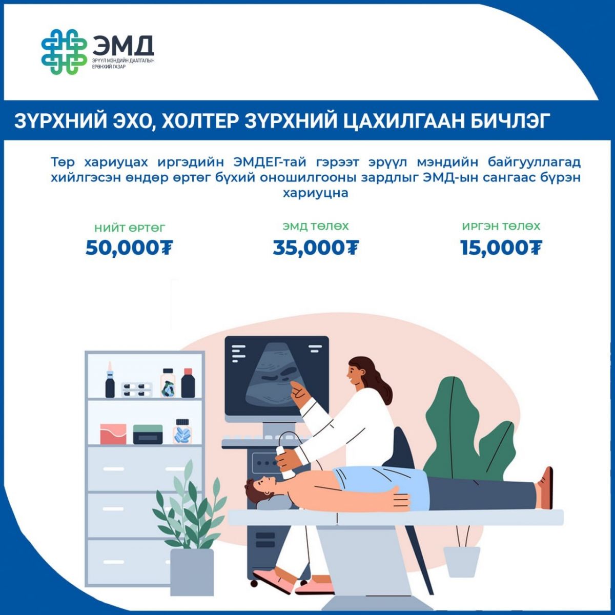 Эрүүл мэндийн даатгалын үндэсний зөвлөл /ЭМДҮЗ/-ийн 2022 оны 01 дүгээр тогтоолоор зүрхний эхо, холтер зүрхний цахилгаан бичлэгийн оношилгоог 50 мянган төгрөг байхаар зохицуулсан. Үүний 30 хувийг иргэн өөрөө хариуцан төлнө.