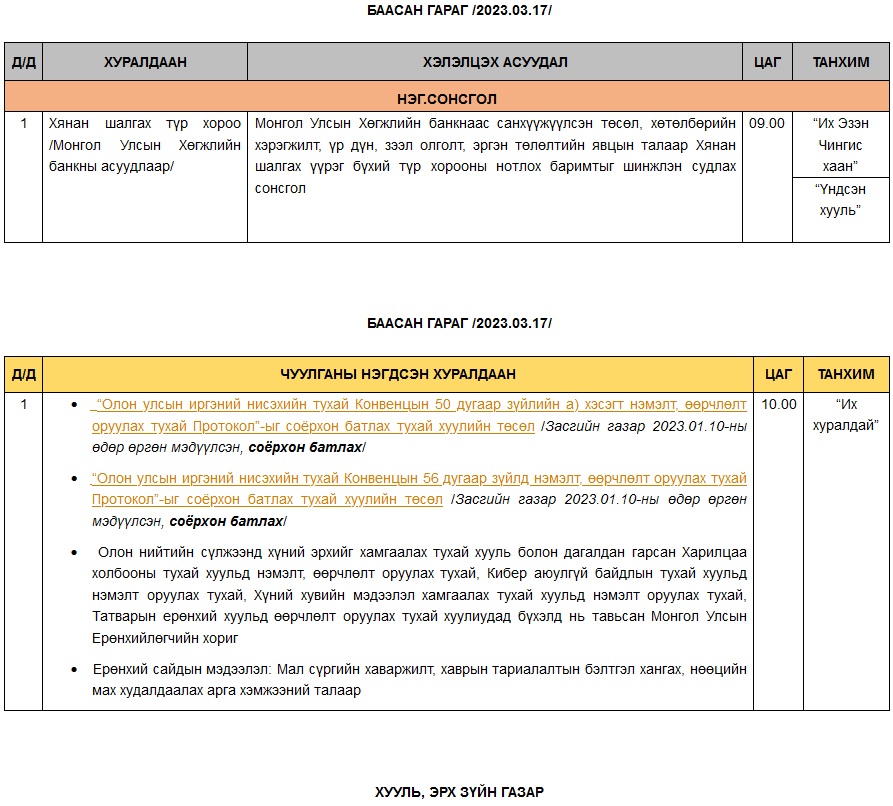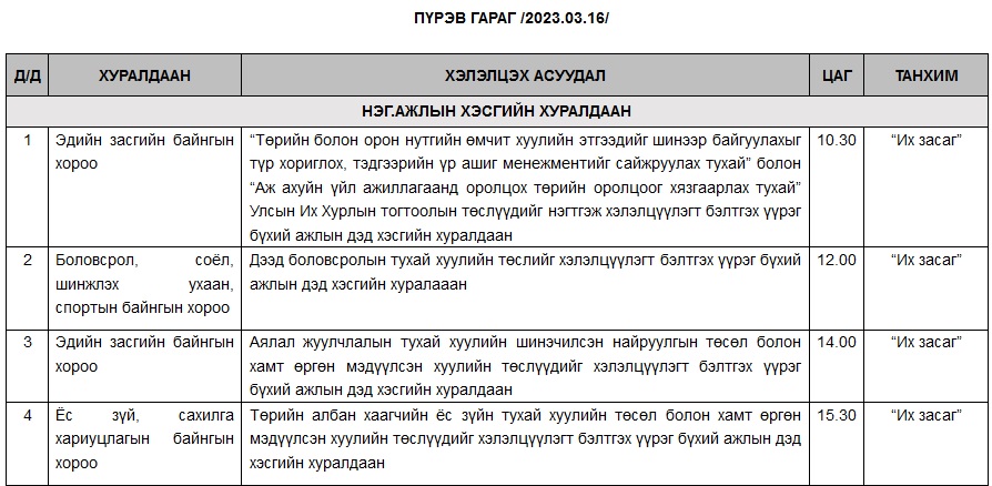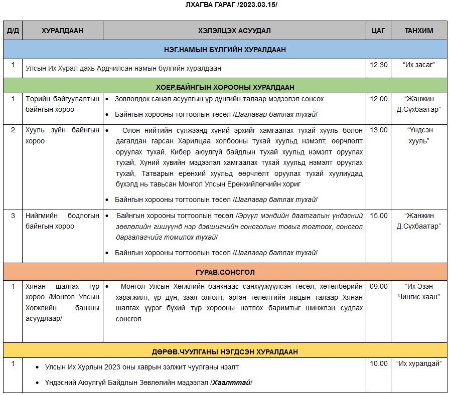 Монгол Улсын Их хурлын 2023 оны хаврын ээлжит чуулганы нээлт өнөөдөр /2023.03.15/ болно.