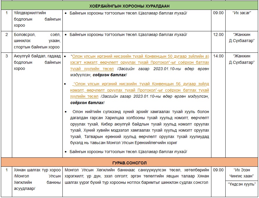 УИХ-аар энэ долоо хоногт хэлэлцэх асуудлын тов, дараалал