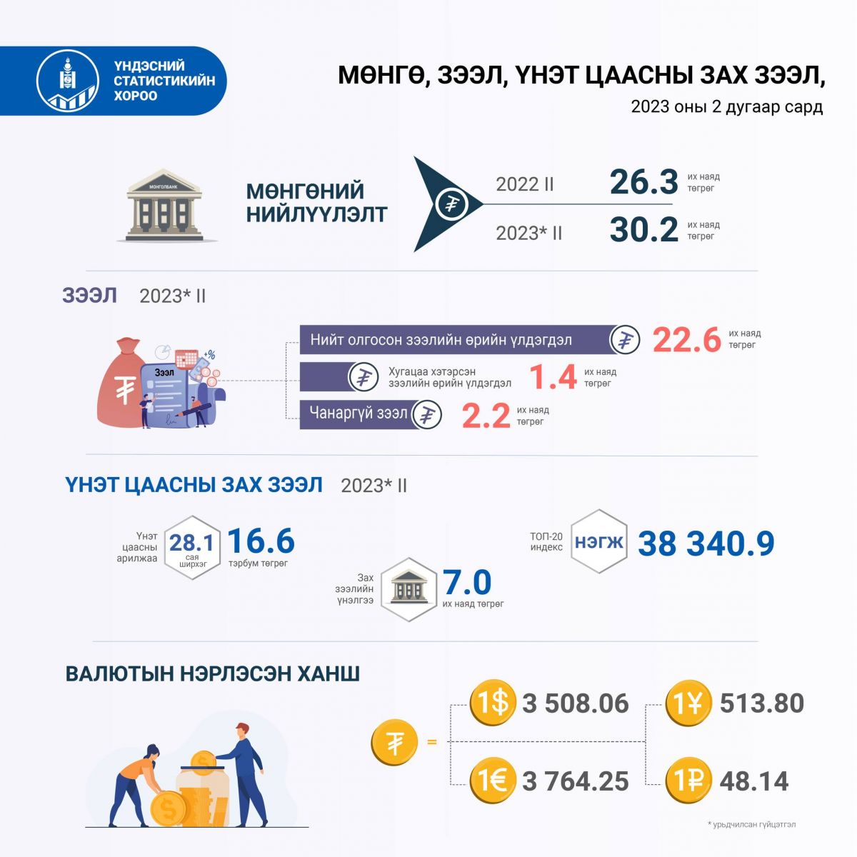 Mөнгөний нийлүүлэлт (M2) энэ оны хоёрдугаар сарын эцэст урьдчилсан гүйцэтгэлээр 30.2 их наяд төгрөг болж, өмнөх оны мөн үеэс 4 их наяд төгрөг буюу 15.2%-иар өсжээ. Энэхүү өсөлтөд валютын харилцах 2.7 их наяд төгрөгөөр буюу 2.2 дахин, валютын хадгаламж 1.6 их наяд төгрөг буюу 38.7%-иар өссөн нь нөлөөлжээ.