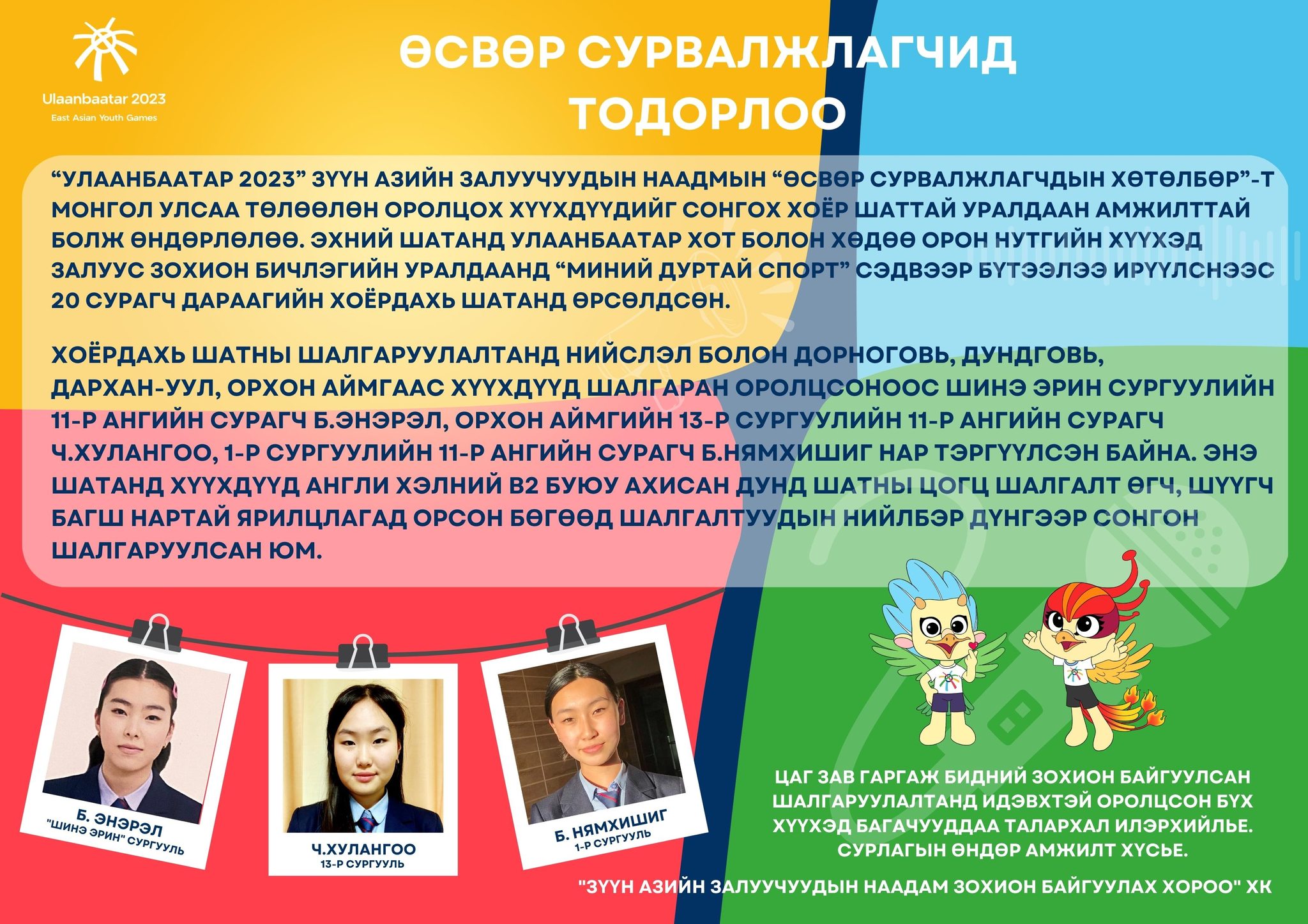 “Улаанбаатар 2023” Зүүн Азийн залуучуудын наадмын “Өсвөр сурвалжлагчдын хөтөлбөр”-т Монгол Улсаа төлөөлөн оролцох хүүхдүүдийг сонгох хоёр шаттай уралдаан амжилттай болж өндөрлөлөө.