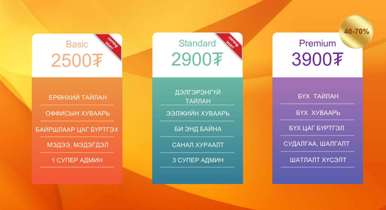 Тус компанийн хамт олон "Basic", "Standart", "Premium" гэсэн гурван төрлийн багцыг хэрэглэгчдэдээ санал болгодог.