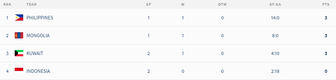 Монгол Улсын Ерөнхийлөгчийн ивээл дор зохион байгуулж буй ДАШТ-ий IV дивизионы тэмцээнд Монгол, Индонез, Кувейт, Филиппиний багууд оролцож байгаа. Эхний тойргийн байдлаар Индонезийг 14:0 бут ниргэсэн Филиппиний баг хүснэгтийг тэргүүлж байна. Кувейтийг 8:0 буулган авсан манай шигшээ гоолын харьцаагаар хоёрт бичигдэж байгаа юм.