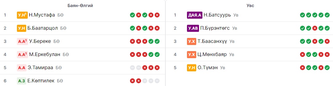 Увс аймгийн багт даян аварга Н.Батсуурь /5/, улсын аварга П.Бүрэнтөгс /4/, улсын харцага Т.Баасанхүү /3/, улсын харцага Ц.Мөнхбаяр/2/, улсын начин О.Түмэн /3/,  нийт 17 даваа авсан бол Баян-Өлгий аймгийн багт улсын өсөх идэр начин Н.Мустафа /2/, улсын начин Б.Баатарцол /2/, аймгийн хурц арслан У. Береке /2/, аймгийн хурц арслан М.Еркебулан /2/, аймгийн заан Е. Көптилек /0/ гуравдугаар тойргоос сэлгээнд сууж, түүний оронд орж барилдсан аймгийн арслан Э.Тамираа /0/ нийт 8 даваа авсан юм.