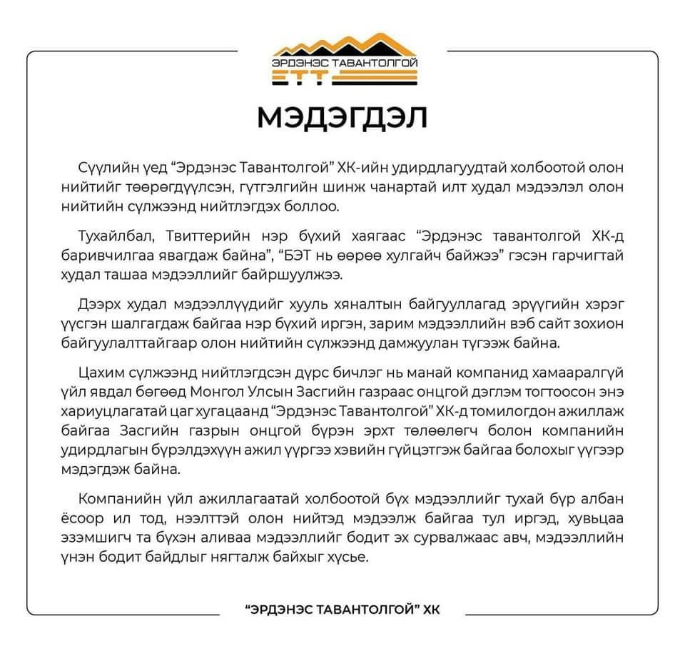 Олон нийтийн сүлжээнд сүүлийн үед гарч байгаа "Эрдэнэс Тавантолгой" ХК-ын удирдлагуудтай холбоотой мэдээлэлтэй холбогдуулан тус компаниас дараах мэдэгдлийг гаргалаа.
