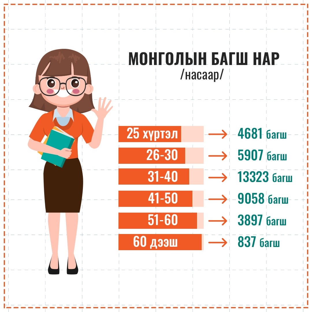 -Монгол Улсын багш нарыг нас болон ажилласан жилээр нь ангилсан зурагт хуудаснаас 5 хүртэл жил ажиллаж байгаа буюу нэмэгдэл бага авах залуу багш нарын тоог харж болно. Багш нарын 75-аас дээш хувь нь тодорхой нэмэгдэл авдаг туршлагатай багш нар байна.
