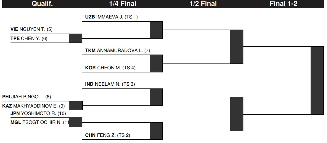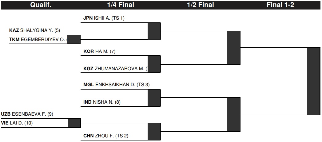 50 кг-д Цогт-Очирын Намуунцэцэг Японы дэлхий, Азийн аварга Рэмина Ёшимототой таарсан. Өмнө нь таарч байсан, сайн танил өрсөлдөгч. Түүнийг ялахад Хятадын тамирчинтай барилдана.