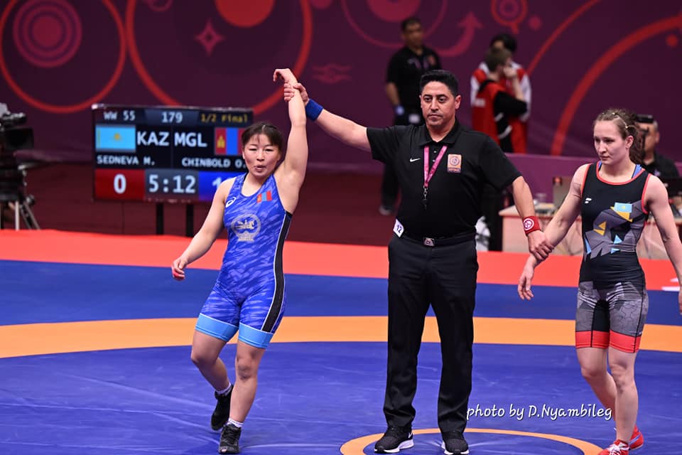 Өнөөдөр эмэгтэй 50, 55, 59, 68, 76 кг-ын барилдаанууд явагдаж байна. Манай таван бөх дэвжээнд гарснаас хагас шигшээд ганцхан бөх үлдсэн. 55 кг-д Чинболдын Отгонтуяа хагас шигшээд Казахстаны Марина Седневаг ялснаар алтан медалийн төлөө орой 20.00 цагаас барилдах боллоо. Өрсөлдөгч нь Хятадын PANG Qianyu. Хятад бөх хагас шигшээд Японы Катаокаг 6:1 илүүрхжээ.