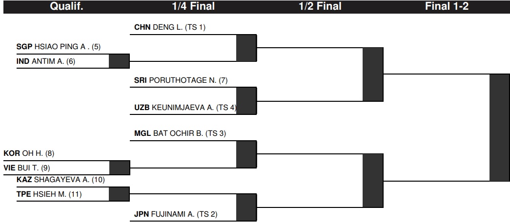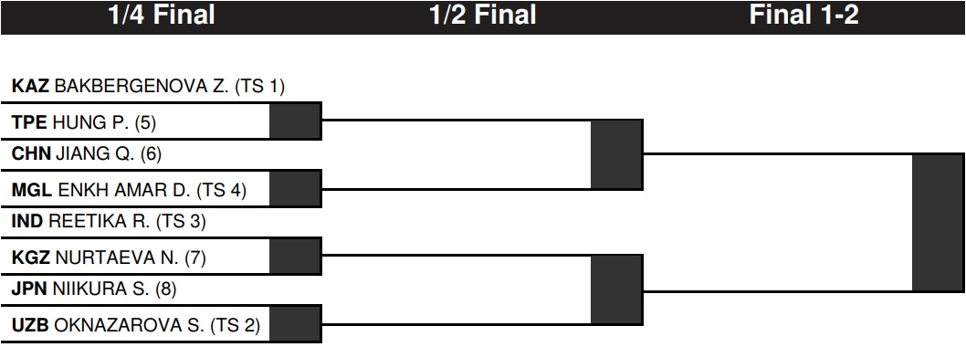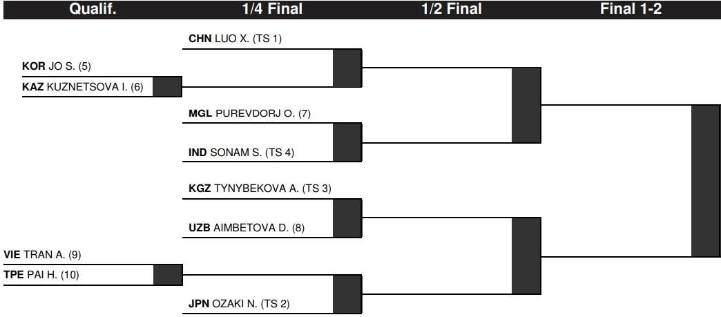 57 кг-д Бат-Эрдэнийн Эрдэнэсувд эхлээд Вьетнамын Thi Anh TRAN-тай таарсан. Ялахад ДАШТ-ий хүрэл медальт, Азийн аварга, Японы Саэ Нанжотой барилдах юм.