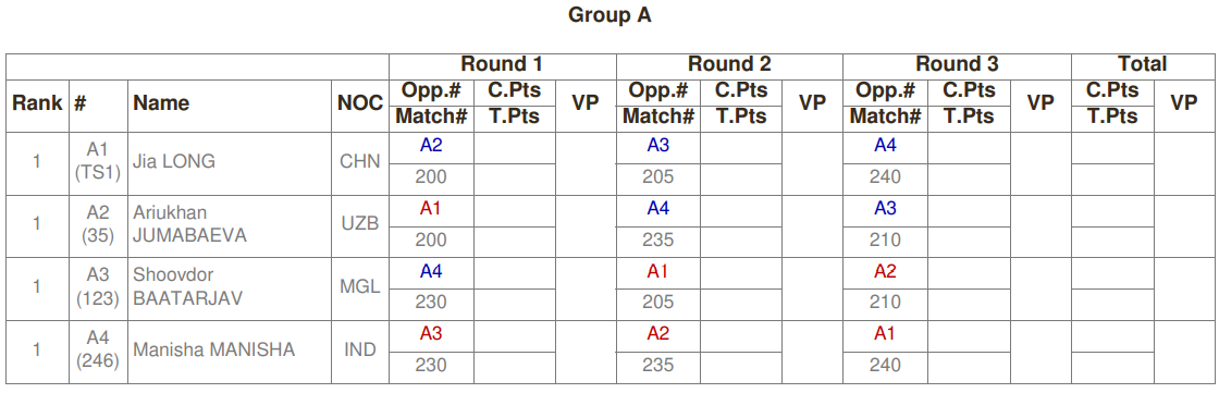 65 кг-д Б.Шоовдор барилдана. Энэ жинд бөхчүүд хоёр хэсэг болон тойргоор барилдах юм. Манай бөх эхлээд Энэтхэгийн Маниша Манишатай барилдана. Энэ хэсэгт хятад, Узбекистаны бөхчүүд байгаа.