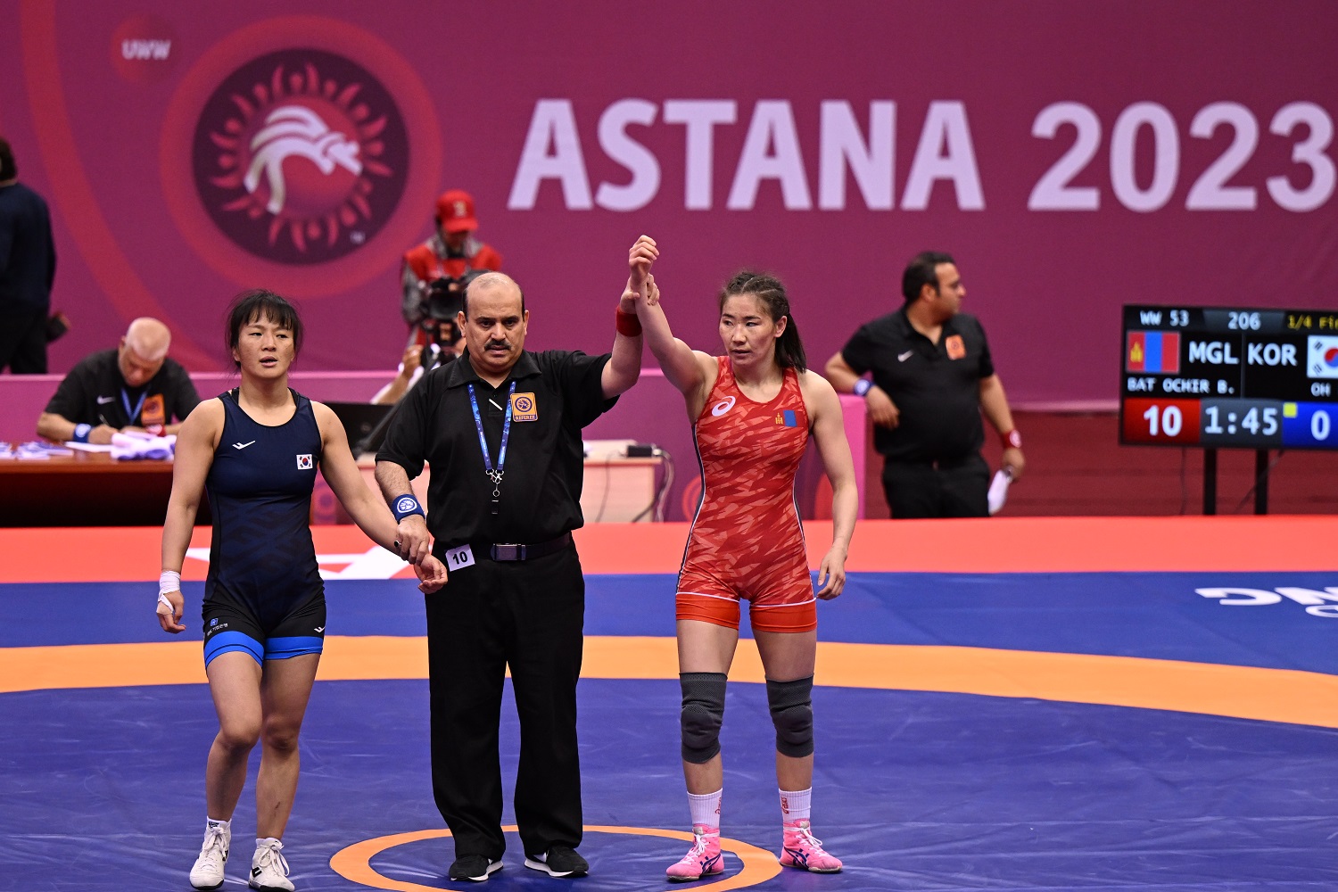 53 кг-д манай олимп, дэлхийн хүрэл медальт Бат-Очирын Болортуяа барилдана. Эхний тойрогт хийлж, дараагийн тойрогтоо Өмнөд Солонгосын Hyunyoung OH-той барилдаж, итгэл төгс оноогоор цэвэр яллаа. Хагас шигшээд Японы супер охин, 2021 оны Ослогийн дэлхийн аварга, 111 дараалан ялаад байгаа Акари Фүжинамитай өрсөлдөнө.