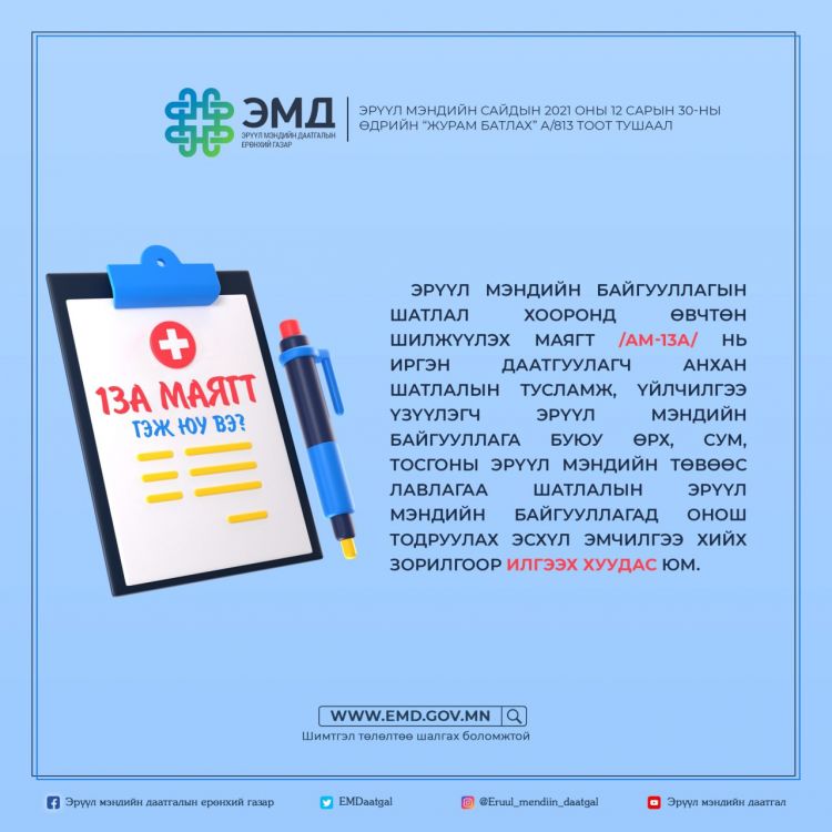13А маягтыг иргэнд хүргэхэд шаардлагатай хөгжүүлэлтийг хийж төрийн цахим үйлчилгээний “И-Монголиа” системд нэгтгэж, “Үйлчилгээ” цэсийн “Эрүүл мэнд” ангилалд 13А цахим маягтыг байршуулсан.