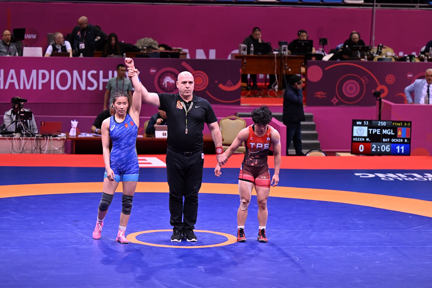53 кг-д манай олимп, дэлхийн хүрэл медальт Бат-Очирын Болортуяа эхлээд Өмнөд Солонгосын Hyunyoung OH-той барилдаж, оноогоор цэвэр ялсан. Хагас шигшээд Японы 2021 оны Ослогийн дэлхийн аварга, 117 дараалан ялаад байгаа Акари Фүжинамид эхний үед 10:0 оноогоор цэвэр ялагдсан. Манай бөх хүрэл медалийн төлөө Тайванийн бөхтэй барилдсан. Мэн Шуань Шиэг манай бөх илүүрхсээр оноогоор цэвэр яллаа.