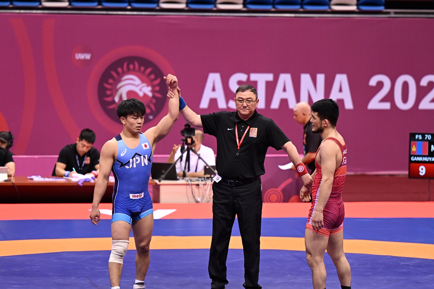 70 кг-д Ганхуягийн Ханбүргэд эхний тойрогт 2022 оны залуучуудын ДАШТ-ий хүрэл медальт, Японы Аояги Ёшиносүкэтэй барилдлаа. 10:1 япон бөх ялж яваад нүдний линз нь уначихсан. Дэвжээнээс линзээ олоод хийгээд барилдахдаа япон бөх юм харахаа байсан бололтой. Манай бөх онооо түүн, 10:5 болгож ойртуулсан. Удалгүй оноо 9:12 байх үед Г.Ханбүргэд тойроод ард нь гарчихад л ялах байсан ч чадсангүй. Ингээд 15 секунд дутуу байхад оноогоо нөхөх гэж дайраад сөрөг мэхэнд орж, 9:19 ялагдлаа.