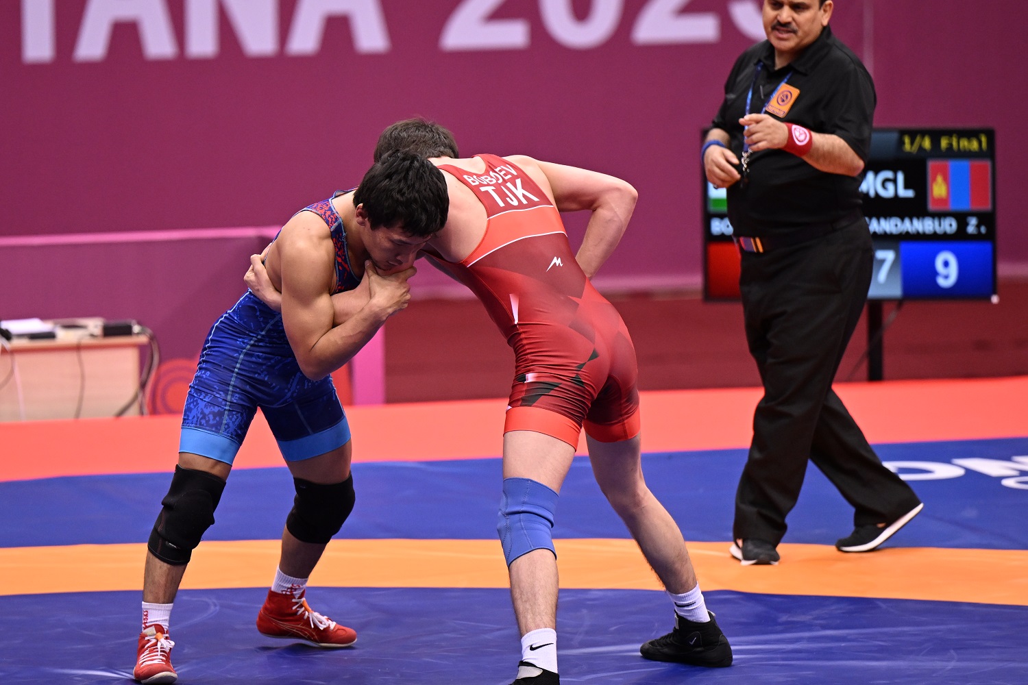 57 кг-д Занданбудын Занабазар эхний тойрогт хийлж, дараагийн тойрогт Тажикстаны дагестан залуу Сунатулло Бобоевтой барилдлаа. Манай бөх тун хянуур барилдаж, 9:0 ялсан. Дараагийн тойрогт Киргизийн Almaz SMANBEKOV-той барилдана.