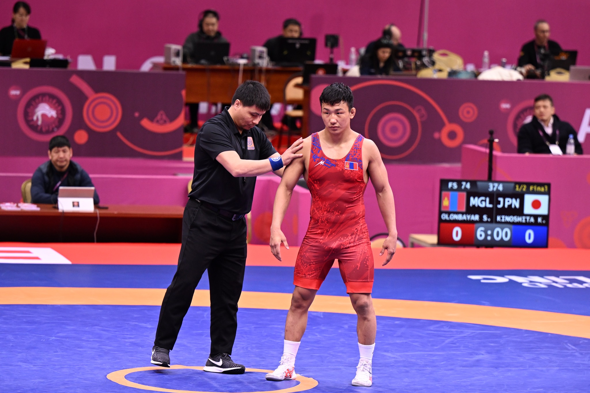 Азийн аварга шалгаруулах тэмцээний сүүлийн өдөр эрэгтэйчүүдийн 74 кг-ын жинд "Алдар" спорт хорооны тамирчин, спортын мастер Олонбаярын Сүлдхүү Катар, Тажикистаны бөхчүүдийг ялаад байсан. Тэгвэл дөнгөж сая хагас шигшээд Японы Киран Киношитатай хүч үзэж, 2:12-оор ялагдлаа.