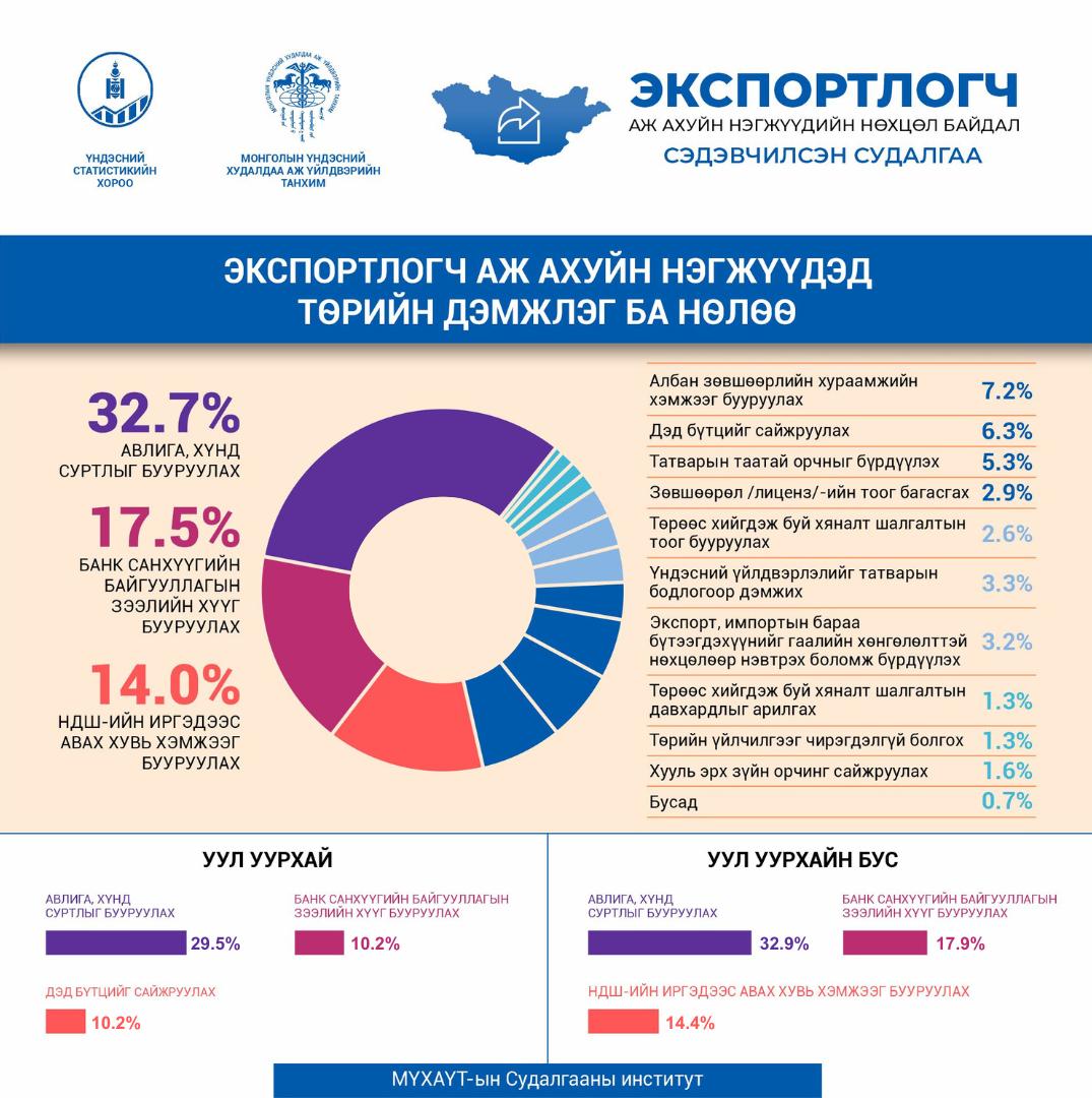 МҮХАҮТ-аас “Монгол Улсын экспортлогч аж ахуйн нэгжүүдийн сэдэвчилсэн судалгаа”-ны үр дүнг танилцууллаа. Судалгааг МҮХАҮТ, ҮСХ-той хамтран ААНБ-ын тооллогын үр дүнд үндэслэн боловсруулсан бөгөөд экспортлогч аж ахуйн нэгжүүдийг бүрэн хамтруулсан анхны судалгаа юм. Монгол Улсын экспортын салбар 2022 онд оны үнээр 12.5 тэрбум ам.долларт хүрч, үнийн дүнгээр ДНБ-ий 83.2 хувьтай тэнцэж байна. Үйл ажиллагаа явуулж буй аж ахуйн нэгжүүдийн 4.2% нь экспортлогч бөгөөд түүхий эд бэлтгэн нийлүүлэгч, ханган нийлүүлэлтийн сүлжээний оролцогч талуудыг тооцвол илүү өргөн салбарыг хамарсан манай улсын эдийн засгийн нөлөө бүхий салбар болжээ.