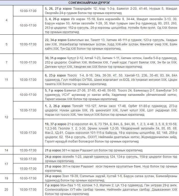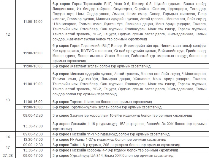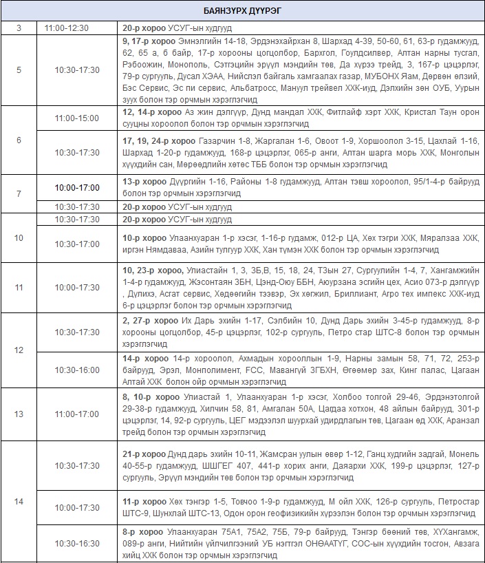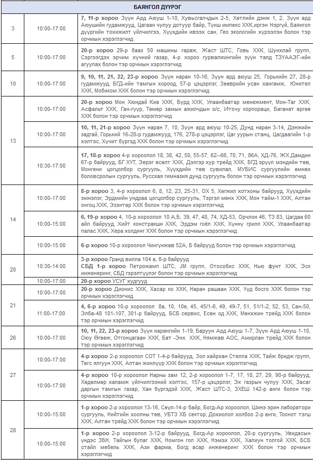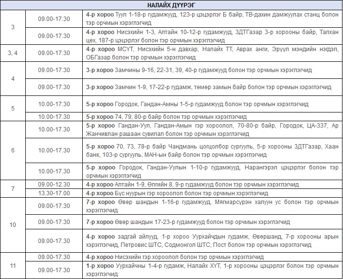 Энэ сард нийслэлийн найман дүүрэг, орон нутгаас Завхан аймгийн Зуунмод хотод цахилгаан хязгаарлаж, засвар үйлчилгээ хийхээр төлөвлөжээ.