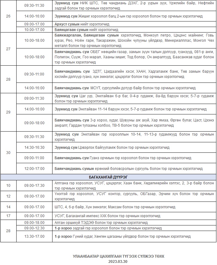 "Улаанбаатар цахилгаан түгээх сүлжээ" ТӨХК-аас гаргасан 2023 оны дөрөвдүгээр сард цахилгаан шугам тоноглолд засвар үйлчилгээ хийх хуваарийг хүргэе.