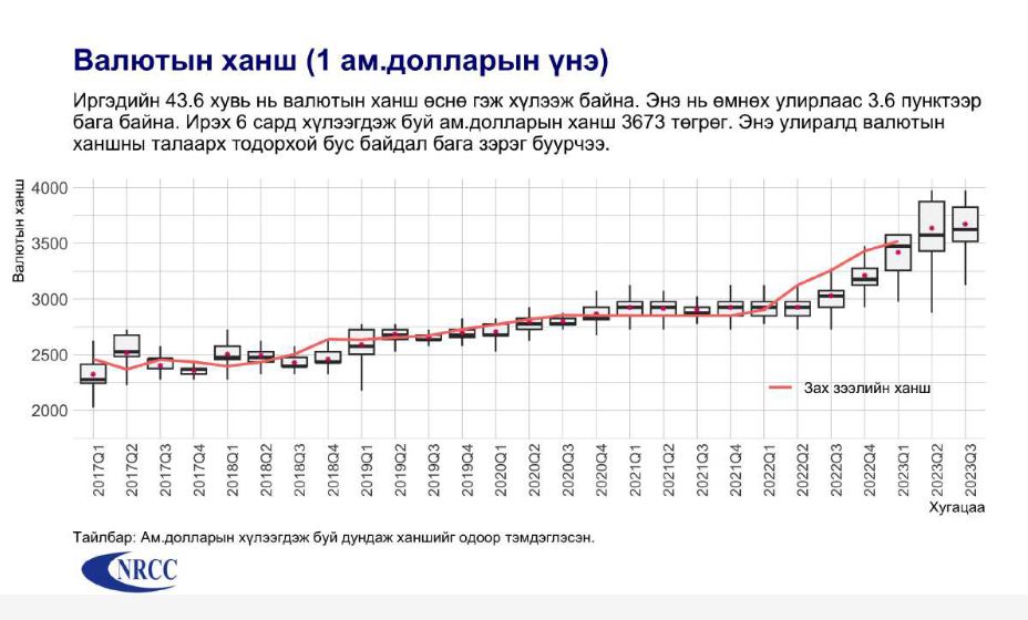 Судалгаанд оролцсон хэрэглэгчдийн 43.6 хувь нь ам.долларын ханш ирэх зургаан сарын хугацаанд өснө гэсэн хүлээлттэй байна. Энэ нь өмнөх улирлаас 3.1 пунктээр буурсан дүн юм. Ам.долларын хүлээгдэж буй дундаж ханш өмнөх улирлаас 1 хувиар өссөн. Ханшийн талаарх тодорхой бус байдал өнгөрсөн улирлаас буурчээ.