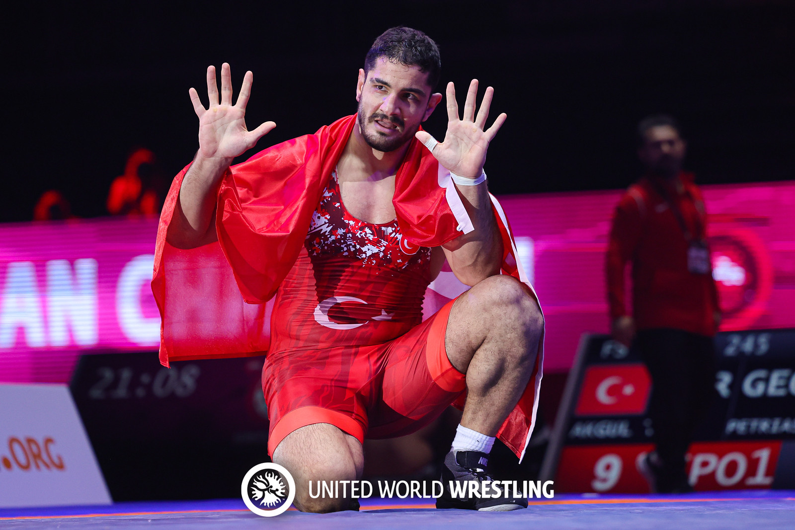 Олимпын аварга, Туркийн Таха Акгуль олимпын мөнгө, хүрэл медальт, Гүржийн Гено Петриашвилитай аваргын төлөө барилдлаа. Хүчтэнүүд хоорондоо ес дэх удаагаа таарч байгаа нь энэ бөгөөд Таха 9:4 ялж, барилдааны харьцаагаа 6:3 болголоо.