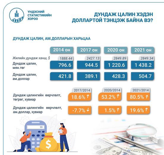 Тэгэхээр 2014 оноос хойших үзүүлэлтүүдийг харахад бодит цалингийн өсөлт 15 хувь ч хүрээгүй бол төгрөгөөр илэрхийлэх дундаж цалин хоёр дахин өссөн ч,  энэ дүнг ам.доллароор жишвэл долоон жилийн хугацаанд 80 гаруй ам.доллароор л өссөн байгаа юм.