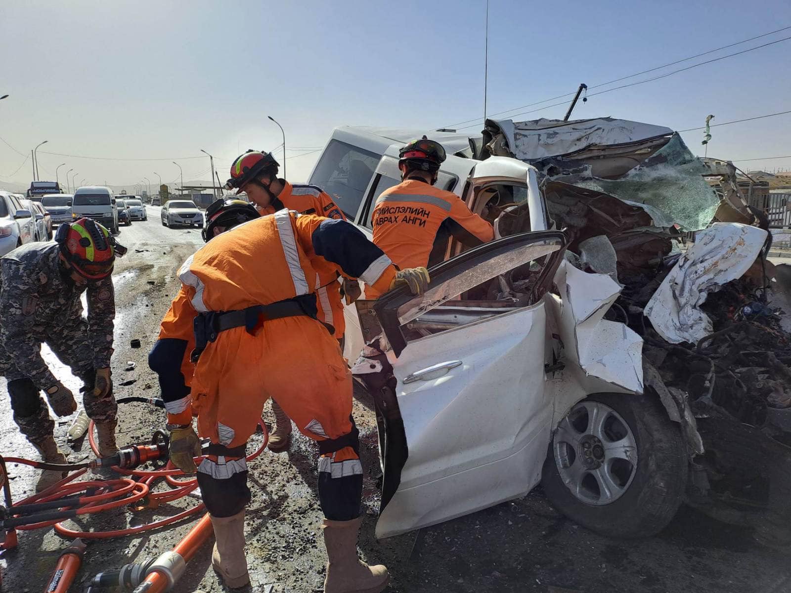 Сонгинохайрхан дүүргийн 20 дугаар хороо 22-н товчоо явах замд автомашин мөргөлдөж хүн хавчуулагдсан гэх дуудлага НОБГ-т 16:25 цагт иржээ